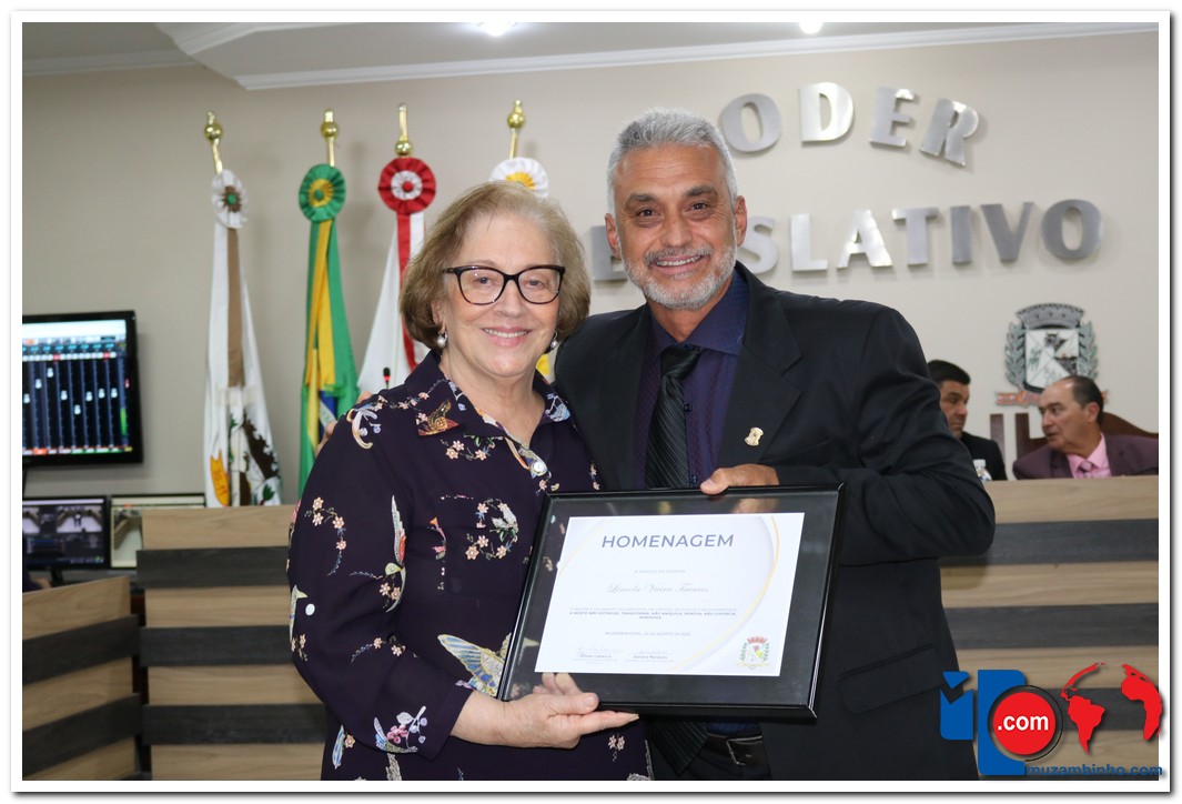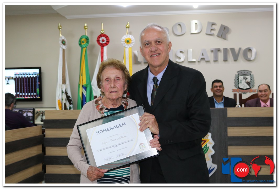 – Lázaro Cesarino Ribeiro, que nasceu em 12 de junho de 1933 na cidade de Muzambinho e faleceu em 29 de maio de 2019. Seu filho Marcos Vinícius de Mello Ribeiro, assessor do Legislativo, fez a entrega de placa à esposa do homenageado, Sra. Aparecida Mello Ribeiro.