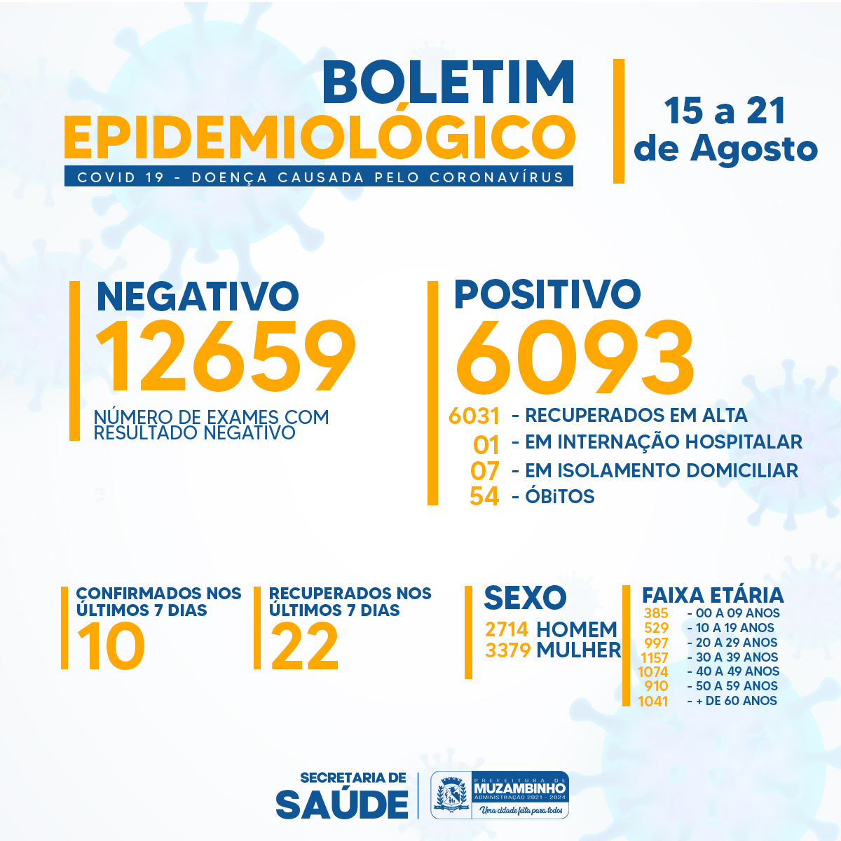 No período de 15 a 21 de Agosto, foi confirmado o resultado positivo para Covid-19 de Dez pacientes em Muzambinho, sendo 4 do sexo masculino e 6 do sexo feminino.