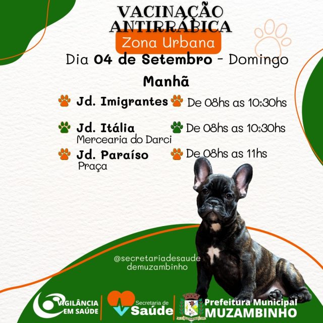 A Secretaria Municipal de Saúde, através do serviço de Vigilância em Saúde, comunica a toda população que estará realizando no mês de AGOSTO a Campanha de Vacinação Antirrábica para cães e gatos.