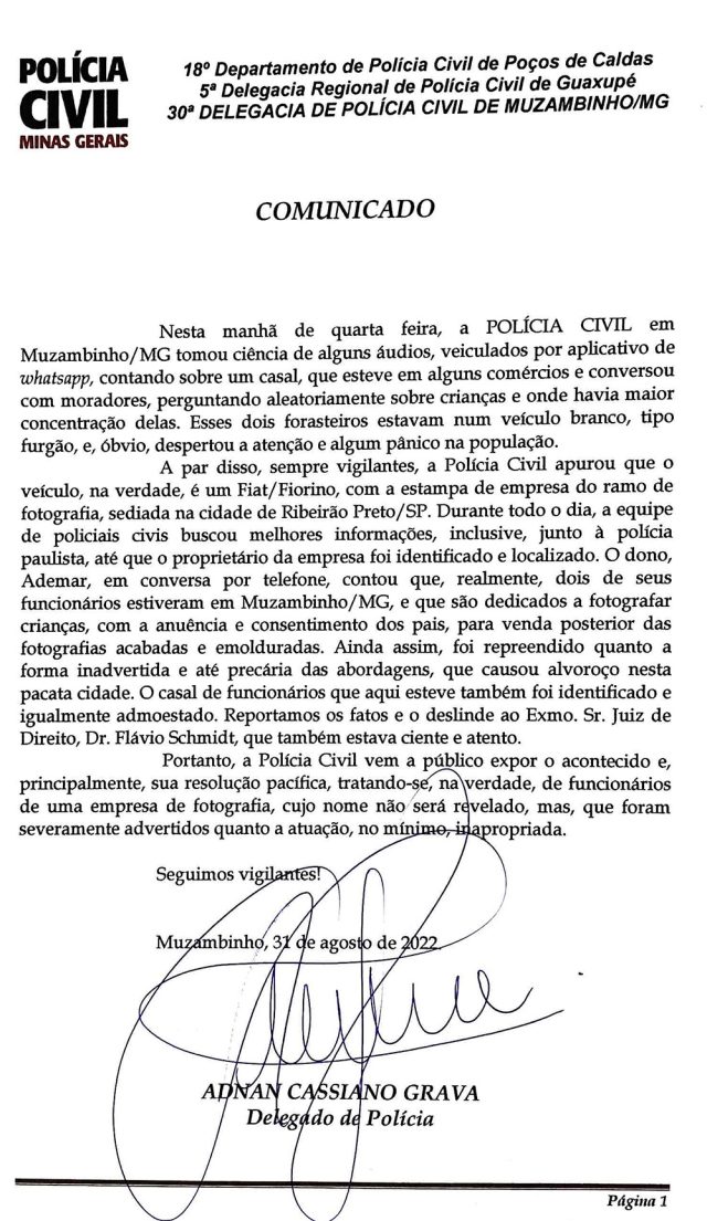 Mais Artigos DestaqueReflexão O barulho do mundo e o silêncio que nos falta DestaqueLegislativoNossa CidadePolítica Confira as falas da 6ª Reunião Ordinária de Vereadores em Muzambinho – 16/03/2026 DestaqueObituário Faleceu aos 85 anos o Sr. Sebastião PinheiroDestaqueJudiciárioNossa CidadePolicialPolícia Civil emite Nota sobre casal em veículo furgão branco. Redação2 de setembro de 20221min0Casal foi identificado e admoestados sobre a prática que causou alvoroço em Muzambinho..Para melhor visualização do documento. Click para visualizar em PDF Documento Post Views: 1.283CasalcriançasPolicia Civil