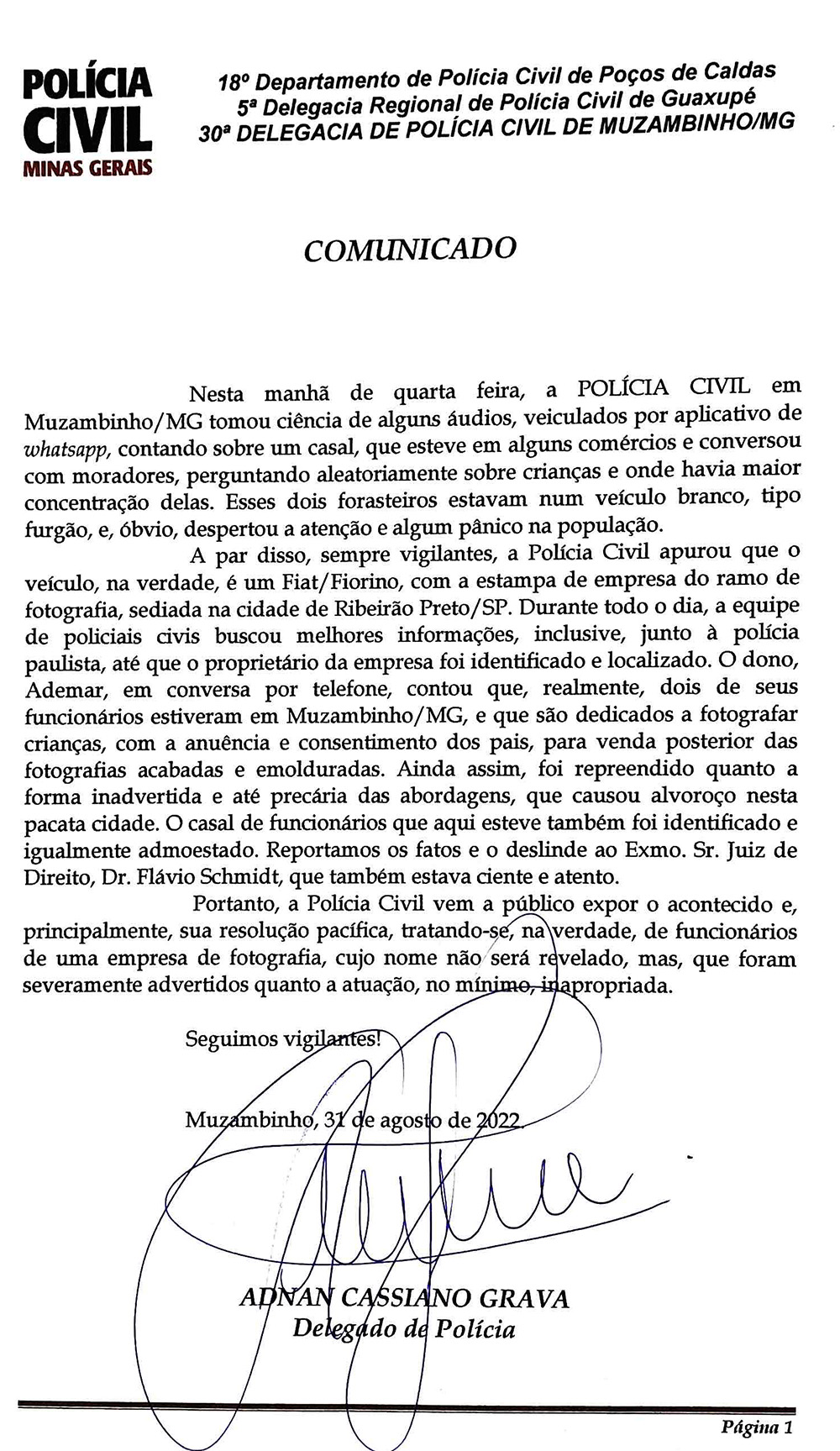 Mais Artigos DestaquePrevisão do Tempo Frente fria intensifica tempestades em seis estados a partir desta sexta-feira (12) AgronegócioDestaqueParceiros Cooxupé está entre os Lugares Mais Incríveis Para Trabalhar 2025 DestaqueEventos e FestasNossa CidadeParceiros ObaOba Samba House agita o Sagrada Família – Bar do Edmar no dia 20 de dezembroDestaqueJudiciárioNossa CidadePolicialPolícia Civil emite Nota sobre casal em veículo furgão branco. Redação2 de setembro de 20221min0Casal foi identificado e admoestados sobre a prática que causou alvoroço em Muzambinho..Para melhor visualização do documento. Click para visualizar em PDF Documento Post Views: 1.233CasalcriançasPolicia Civil