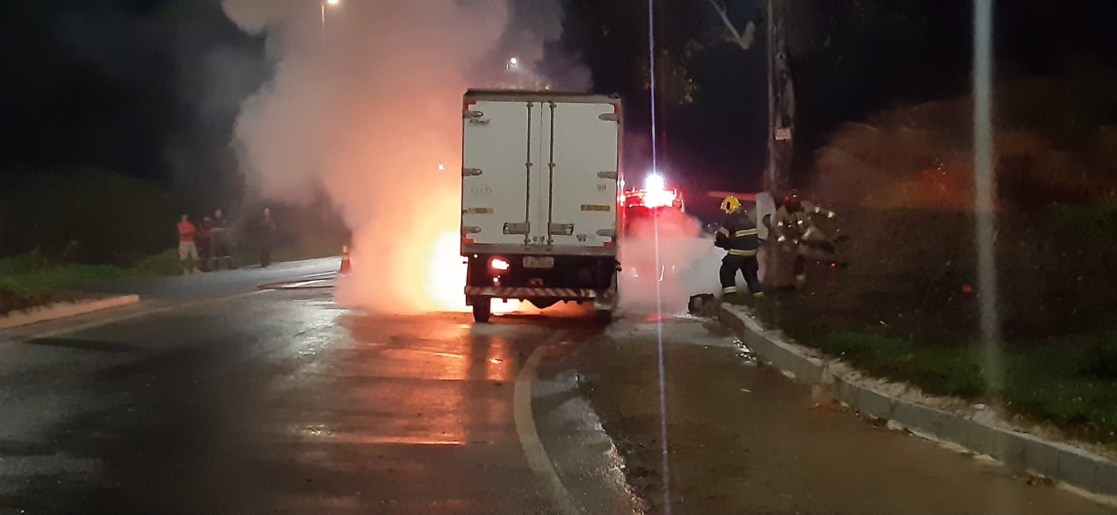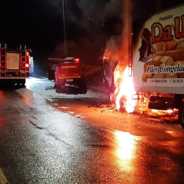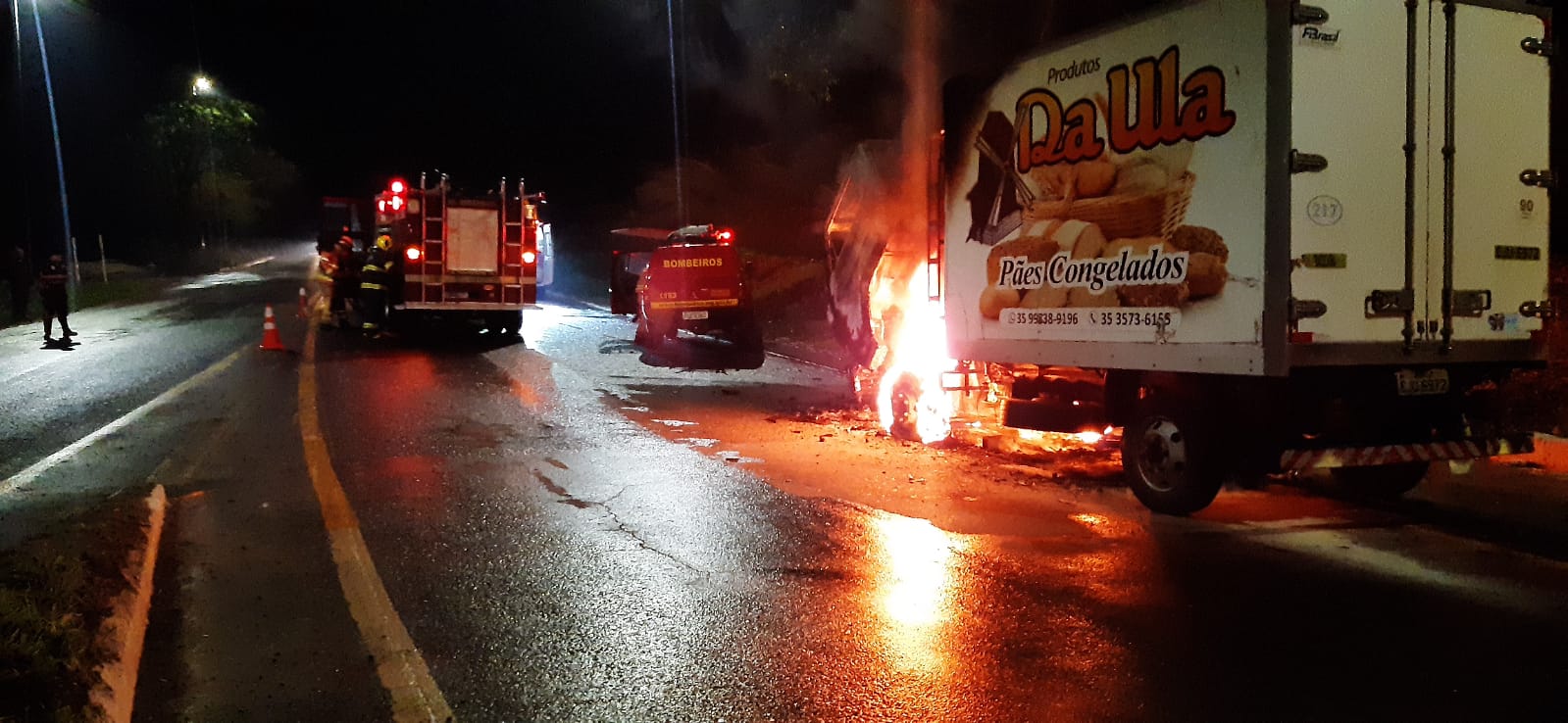 Caminhão pega fogo no trevo da entrada de Muzambinho.