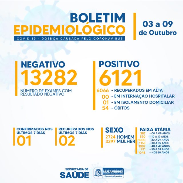 No período de 03 a 09 de Outubro, confirmamos o resultado positivo para Covid-19 de Uma paciente do sexo feminino em Muzambinho.
