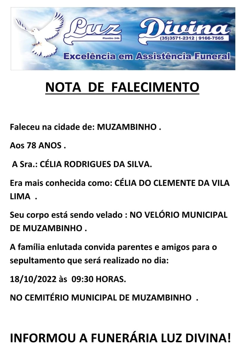 Mais Artigos DestaqueObituário Faleceu aos 77 anos a Sra. Marina de Jesus Silva AniversáriosDestaqueNossa CidadeParceiros Ingrid e Marcelo Rosa celebram aniversários com almoço especial em Muzambinho BelezaDestaqueNossa CidadeParceiros Zahra Cosméticos e Studio Nayara Moraes chega ao Centro de Muzambinho com novidades em beleza e bem-estarDestaqueObituárioFaleceu aos 78 anos, a Sra. Célia Rodrigues da Silva Redação17 de outubro de 20221min0Informou a Funerária Luz DivinaA família enlutada, nossos sinceros sentimentos de pesares, que Deus os abençoe e conforte. Post Views: 616EnterroFuneráriaLuz DivinamorteobituárioSepultamentoVelório