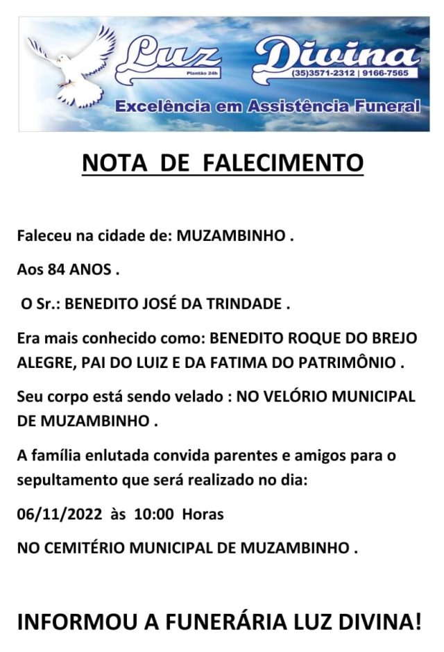 Mais Artigos DestaqueObituário Faleceu aos 78 anos o Sr. Wagner Vieira Gomes DestaqueObituário Faleceu aos 80 anos o Sr. José Carlos Ernesto DestaqueObituário Faleceu aos 69 anos o Sr. Gildo Donizetti NardiObituárioFaleceu aos 84 anos, o Sr. Benedito José da Trindade Redação6 de novembro de 20221min0Informou a Funerária Luz DivinaA família enlutada, nossos sinceros sentimentos de pesares, que Deus os abençoe e conforte. Post Views: 792EnterroFuneráriaLuz DivinamorteobituárioSepultamentoVelório