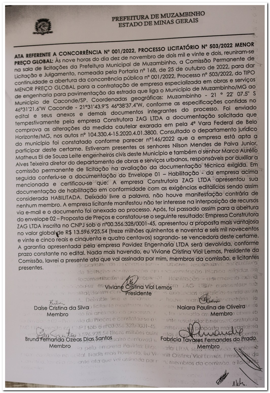 São praticamente cinco anos, desde 2017, de muita luta, agora só falta assinar o contrato com a Empresa vencedora da Concorrência Nº 001/2022, Processo Nº 503/2022, Pavimentação da estrada que liga o Município de Muzambinho/MG ao Município de Caconde/SP, a empresa vencedora foi a Construtora ZAG Ltda., de Belo Horizonte.