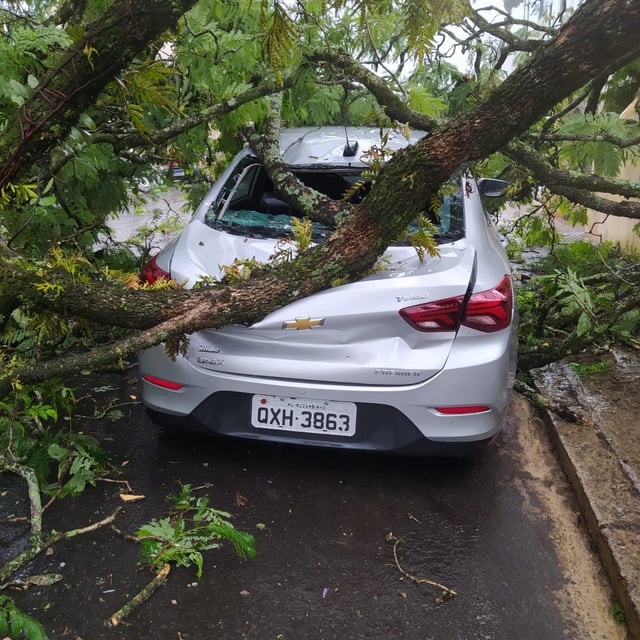 A tempestade causou queda de árvores, destruindo carros e o coreto na Praça Pedro de Alcântara Magalhães.