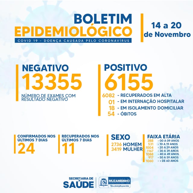 No período de 14 a 20 de Novembro, confirmamos o resultado positivo para Covid-19 de Vinte e Quatro pacientes em Muzambinho, sendo 11 do sexo masculino e 13 do sexo feminino.
