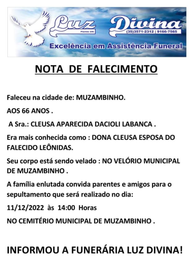 Mais Artigos DestaqueDiversosNosso Estado Estradas mineiras têm restrição para circulação de veículos de grande porte no Natal e Réveillon DestaqueDiversos EPR divulga cronograma de obras de segurança viária com frentes em Muzambinho e outros 19 municípios DestaqueNosso EstadoPrevisão do Tempo Previsão do tempo para Minas Gerais nesta segunda-feira, 22 de dezembroDestaqueObituárioFaleceu aos 66 anos, a Sra. Cleusa Ap. Dacioli Labanca Redação11 de dezembro de 20221min0Informou a Funerária Luz DivinaA família enlutada, nossos sinceros sentimentos de pesares, que Deus os abençoe e conforte. Post Views: 600EnterroFuneráriaLuz DivinamorteobituárioSepultamentoVelório