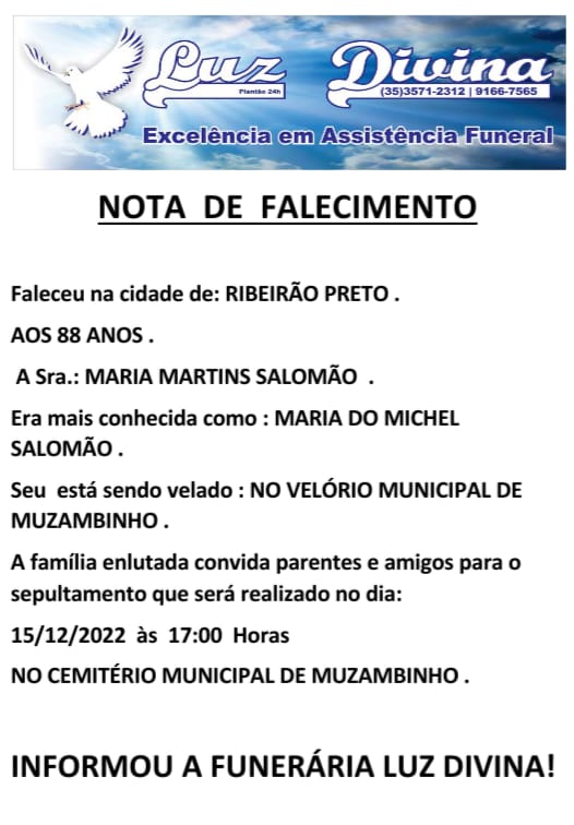 Mais Artigos Cozinha e CulináriaDestaqueNossa CidadeParceiros As melhores lembranças das férias… AgronegócioDestaque Café em Foco, 09/01/26, Cotações e Informações da Cafeicultura DestaqueNossa CidadeSaúde Santa Casa de Muzambinho realizou mais de 34 mil atendimentos em 2025DestaqueObituárioFaleceu aos 88 anos, Maria Martins Salomão Redação15 de dezembro de 20221min0Informou a Funerária Luz DivinaA família enlutada, nossos sinceros sentimentos de pesares, que Deus os abençoe e conforte. Post Views: 640EnterroFuneráriaLuz DivinamorteobituárioSepultamentoVelório