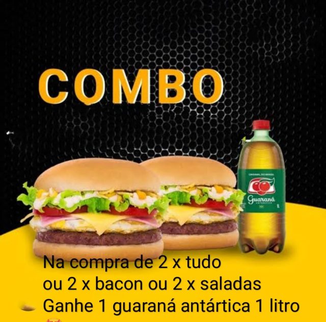 Na compra de 2 x tudo, ou 2 x saladas, ou 2 x bacon você ganha 1 guaraná antártica 1 litro
