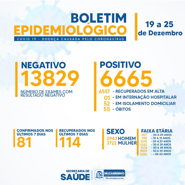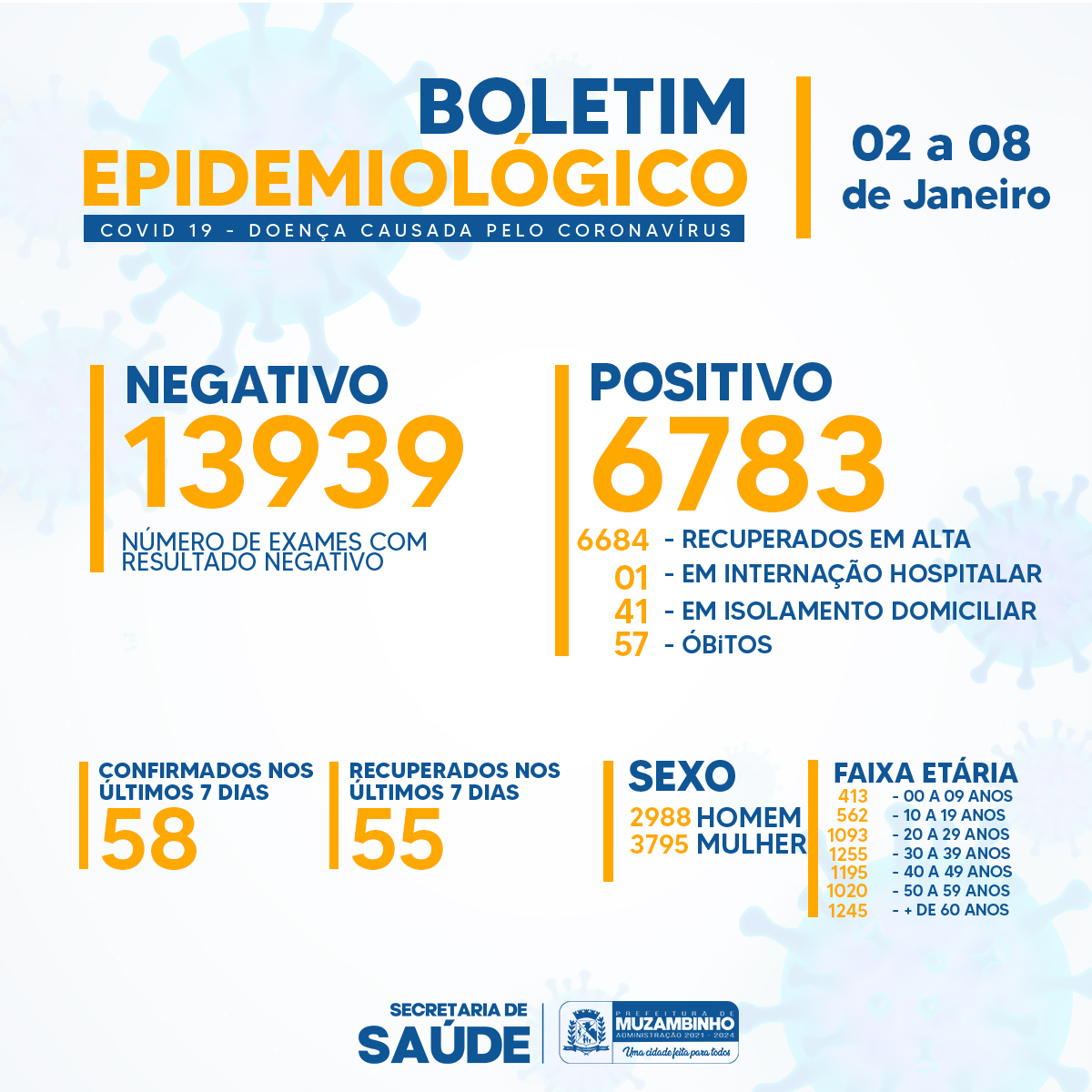 No período de 02 a 08 de Janeiro de 2023, confirmamos o resultado positivo para Covid-19 de 58 pacientes em Muzambinho, sendo 23 do sexo masculino e 35 do sexo feminino.