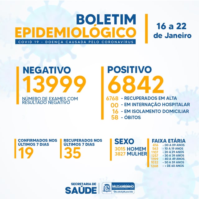 No período de 16 a 22 de Janeiro de 2023, confirmamos o resultado positivo para Covid-19 de 19 pacientes em Muzambinho, sendo 8 do sexo masculino e 11 do sexo feminino.