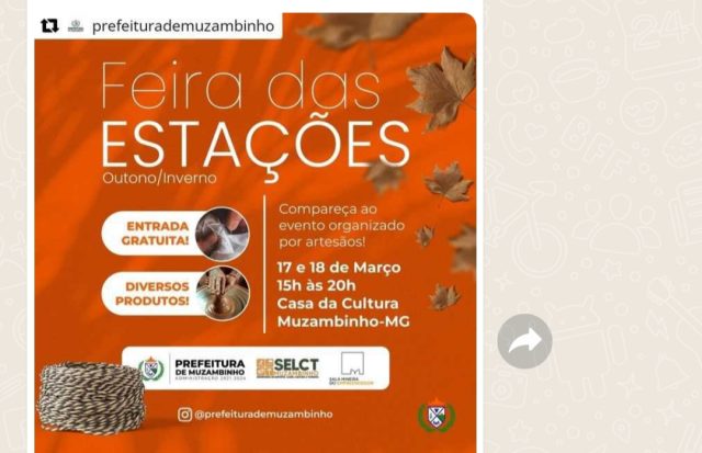 A Feira das Estações teve início nesta sexta-feira, 17/3, e vai até este sábado, 18/3, reúne artesões muzambinhenses e seus trabalhos feitos com muito capricho e qualidade.