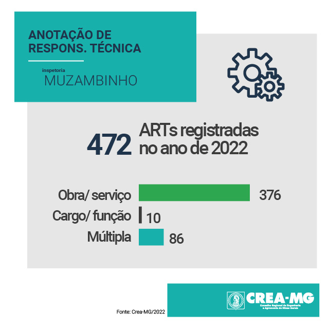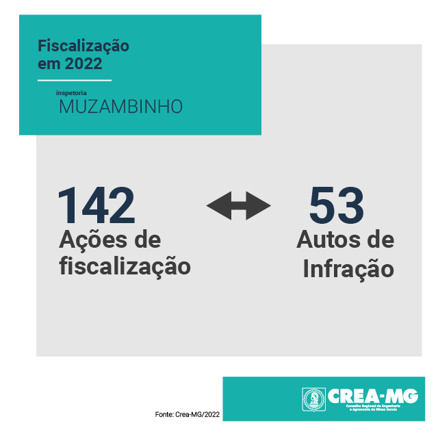 Em 2022, o Conselho Regional de Engenharia e Agronomia de Minas Gerais (Crea-MG) realizou 59.858 ações de fiscalização em todo o estado, aumento de 14,7% em relação a 2021. As ações resultaram em 28.562 autos de infração. A ausência de registro das empresas, faltas de Anotação de Responsabilidade Técnica (ART) e de profissional legalmente habilitado foram as principais irregularidades encontradas. Na inspetoria de Muzambinho, foram realizadas 142 ações, com a identificação de 53 irregularidades. “A nossa atividade principal é combater o exercício ilegal das atividades técnicas, que coloca pessoas e patrimônio em risco”, destaca o presidente do Crea-MG, engenheiro civil Lucio Fernando Borges.