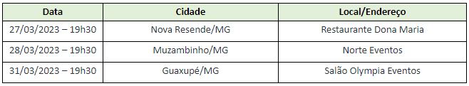 Confira abaixo as datas das próximas assembleias na região Sudoeste de Minas Gerais: