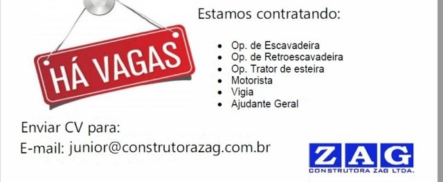 Construtora ZAG está contratando pessoal para trabalhar na obra Muzambinho a Caconde.