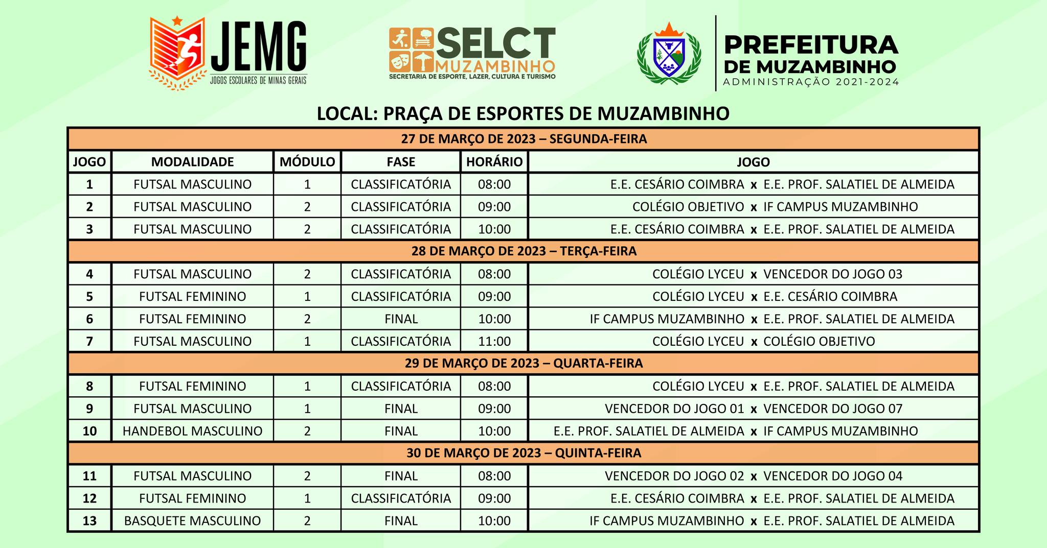 Esta etapa irá selecionar as escolas que representarão o município na fase microrregional, que acontecerá em maio na cidade de Poços de Caldas. Participarão da Etapa Municipal as escolas IFCAMPUSMUZAMBINHO, COLÉGIO OBJETIVO, E.E.PROF. SALATIEL DE ALMEIDA, COLÉGIO LYCEU e E.E CESÁRIO COIMBRA, que disputarão as modalidades de futsal masculino e feminino no módulo 1 e 2, handebol e basquete masculino módulo 2.
