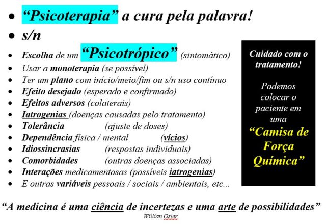 As psicoterapias (com poder de cura) são imprescindíveis na prevenção de recaídas a longo prazo. Todas as modalidades psicoterápicas devem surtir efeito com/sem/apesar do uso de psicotrópicos, utilizados como instrumentos e não como bengalas. São drogas lícitas (medicamentos) de grande utilidade e imprescindíveis no ‘status quo’ da medicina do III milênio!