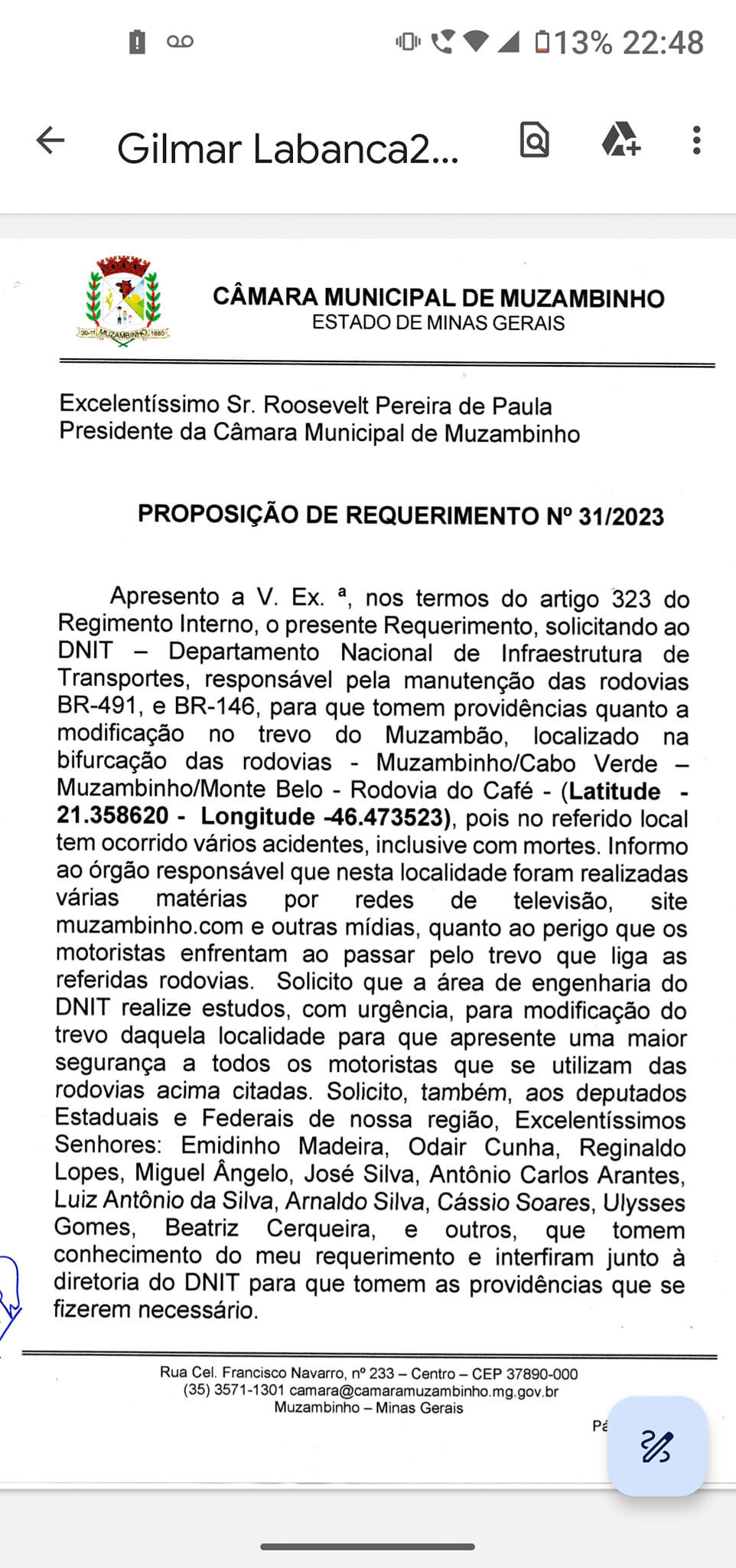 Ver Gilmar Labanca apresenta Requerimento pedindo providências no Trevo do Muzambão.