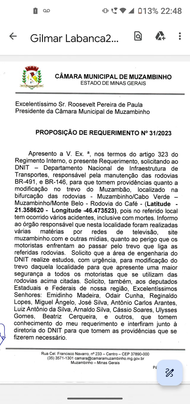 No requerimento o Vereador Gilmar Labanca pede providências das autoridades em relação ao Trevo que liga Muzambinho/Cabo Verde e Muzambinho/Monte Belo, devido ao grande número de acidentes ocorridos ali.
