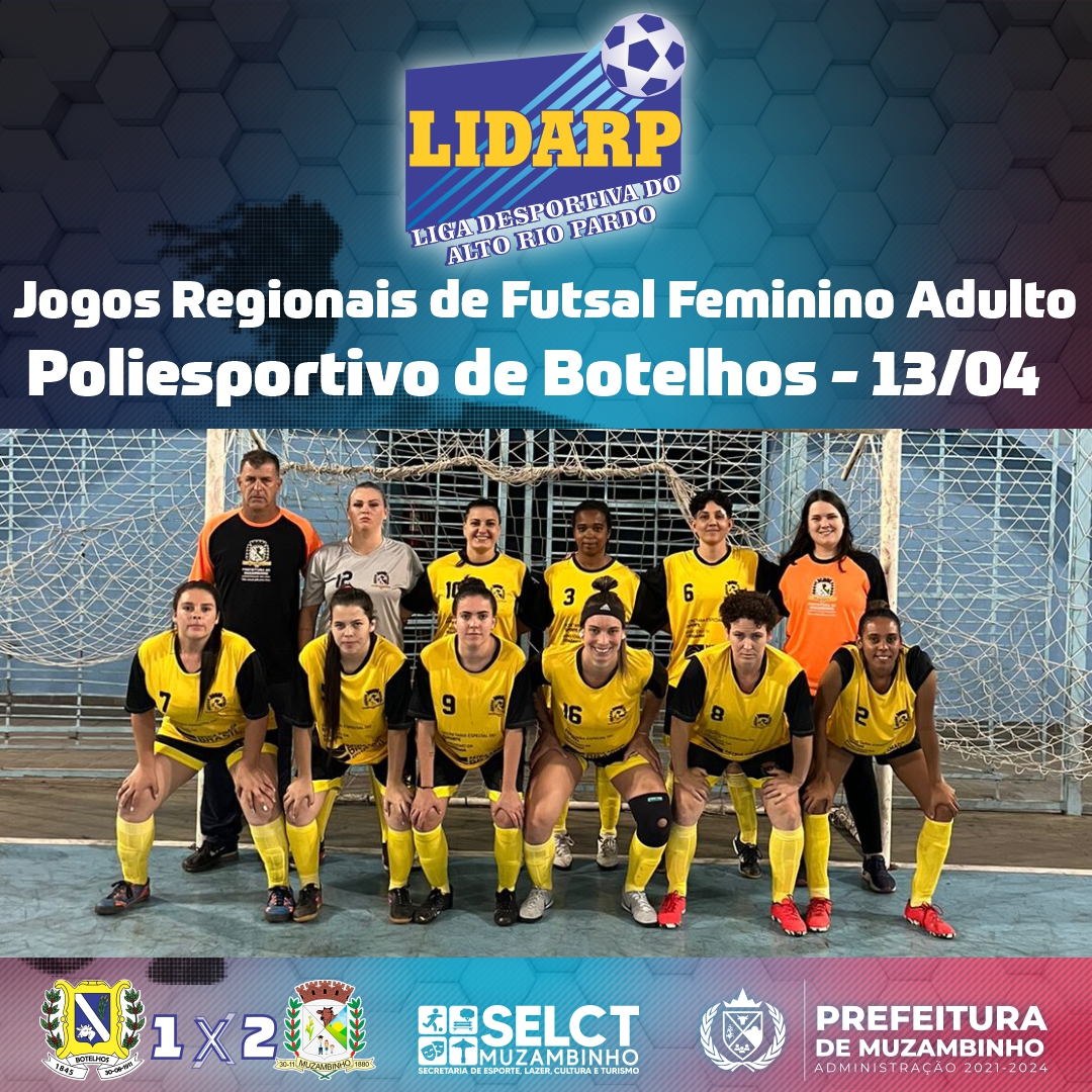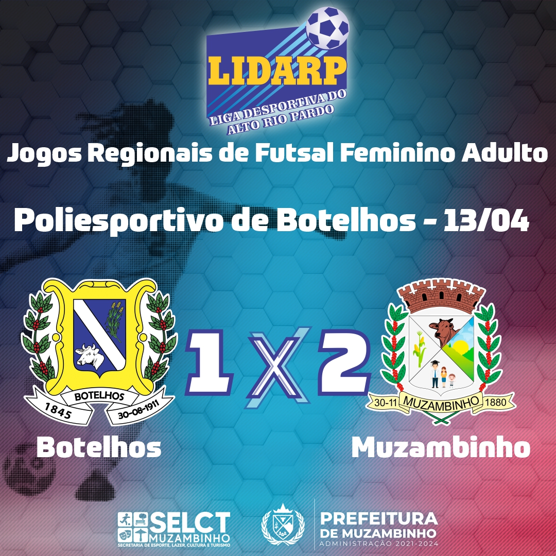 Na noite de ontem (13/04), a equipe de futsal feminino adulto de Muzambinho foi até Botelhos jogar contra a equipe da casa. Em um jogo surpreendente, Muzambinho começou atrás do placar, mas alcançou o empate ainda no primeiro tempo, graças ao empenho das atletas. Na segunda etapa o jogo se torna emocionante com Muzambinho virando o placar do jogo e Botelhos exercendo forte pressão em busca do empate, porém a equipe de Muzambinho manteve se firme e bloqueando todos os ataques sofridos para conquistar sua primeira vitória no campeonato.