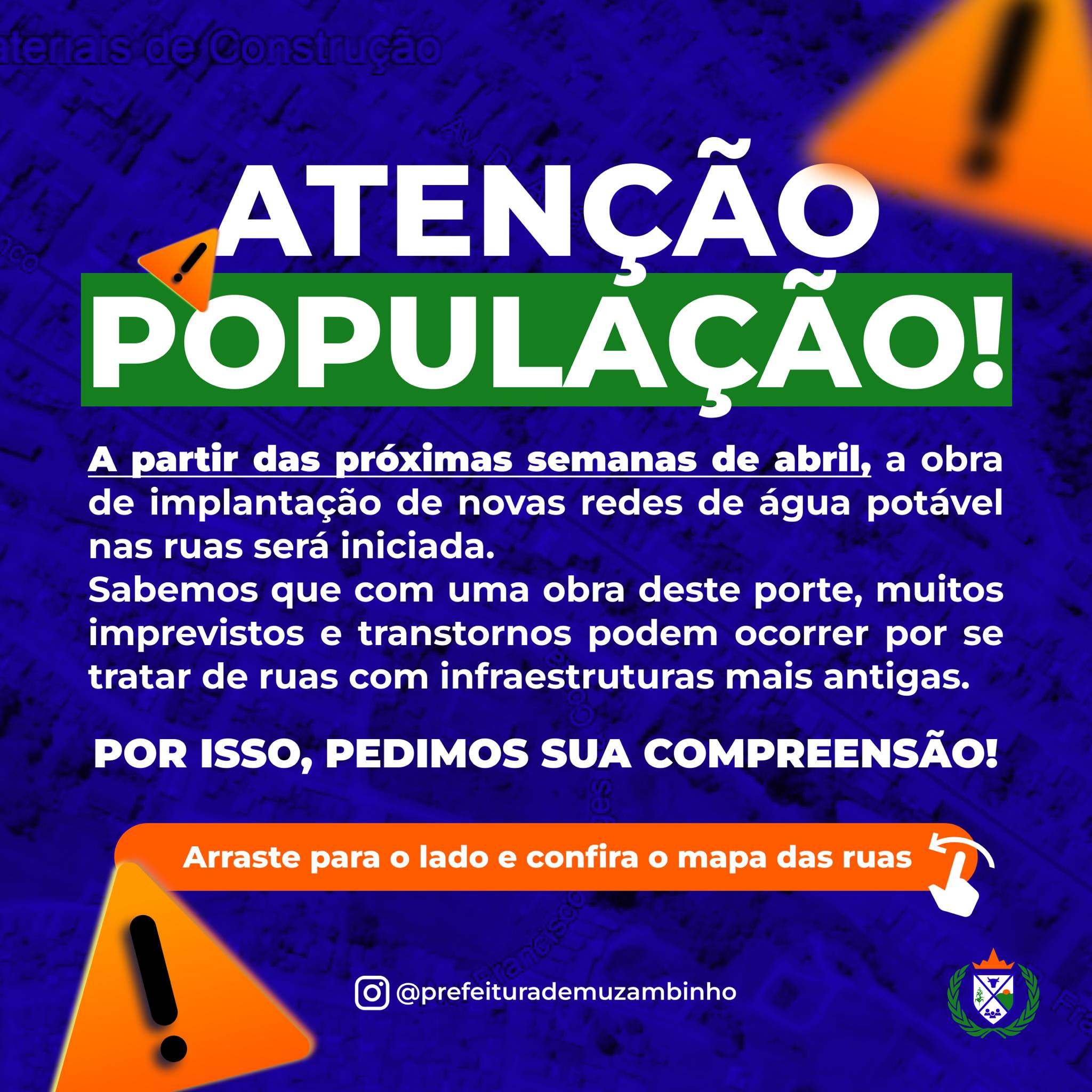 Por ser uma obra de grande porte (trocas de infraestruturas antigas) muitos imprevistos e transtornos podem ocorrer, e por isso, pedimos a compreensão de cada morador da região e de toda a população muzambinhenses.