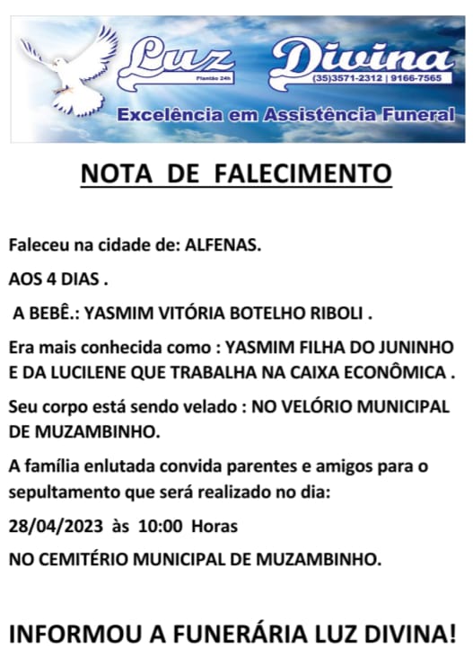 Mais Artigos AgronegócioDestaqueEconomiaParceiros Sicredi financia R$ 3,5 bilhões no Plano Safra 2024/2025 em MG AgronegócioDestaqueSaúde Estudo aponta que café pode contribuir para o envelhecimento saudável DestaqueLegislativoNossa CidadePolítica Confira as falas da 36ª Reunião Ordinária de Vereadores em Muzambinho – 20/10/2025 DestaqueObituárioFaleceu aos 4 dias, a bebê Yasmim Vitória Botelho Riboli Redação28 de abril de 20231min0Informou a Funerária Luz Divina A família enlutada, nossos sinceros sentimentos de pesares, que Deus os abençoe e conforte. Post Views: 796 EnterroFuneráriaLuz DivinamorteobituárioSepultamentoVelório