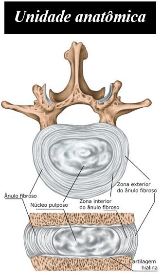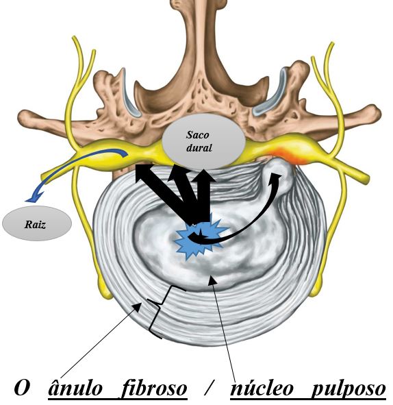 O ânulo fibroso / núcleo pulposo compõe o disco. Quando a anel fibroso se rompe, o núcleo pulposo (gelatinoso) insinua pela rotura. Assim, teremos 3 formas distintas de apresentação do núcleo pulposo e 3 posições diferentes: