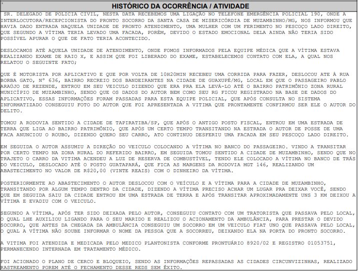 Ao chegar ao local, a motorista encontrou P.A.R., que entrou no carro e solicitou ser levado até o bairro Patrimônio, no distrito de Muzambinho. Durante o trajeto, o criminoso anunciou o roubo, ameaçando-a com uma faca e exigindo apenas o veículo. Ele desferiu uma facada no lado direito do pescoço da motorista e assumiu a direção do carro, colocando-a no banco traseiro.