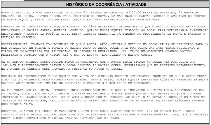 Após a identificação do autor do roubo, a Polícia Militar iniciou um cerco e bloqueio em toda a região. Durante a noite, surgiram informações de que o veículo roubado estava no Jardim América, em Muzambinho, sendo removido. Relatos também indicaram que P.A.R. havia sido visto em um bar no Alto do Anjo, saindo posteriormente com outro motorista de aplicativo em direção ao bairro Cohab. Ele permaneceu em um bar nesse bairro, e câmeras de monitoramento confirmaram sua presença.