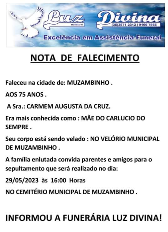 Mais Artigos DestaqueObituário Faleceu aos 71 anos o Sr. Antônio de Lima DestaqueObituário Faleceu aos 70 anos o Sr. João Ambrósio da Silva DestaqueMensagens O Muzambinho.com deseja um Feliz Natal a todos os nossos internautasDestaqueObituárioFaleceu aos 75 anos, a Sra. Carmem Augusta da Cruz Redação29 de maio de 20231min0Informou a Funerária Luz DivinaA família enlutada, nossos sinceros sentimentos de pesares, que Deus os abençoe e conforte. Post Views: 668EnterroFuneráriaLuz DivinamorteobituárioSepultamentoVelório