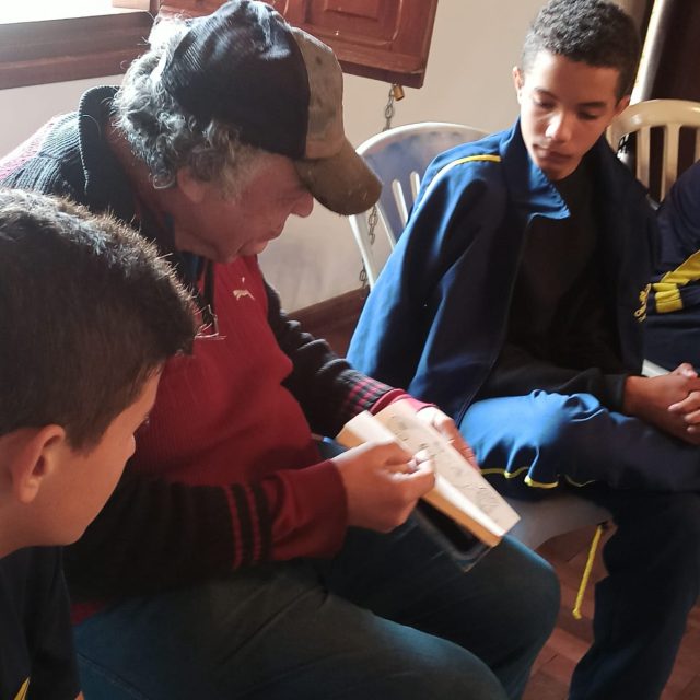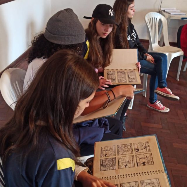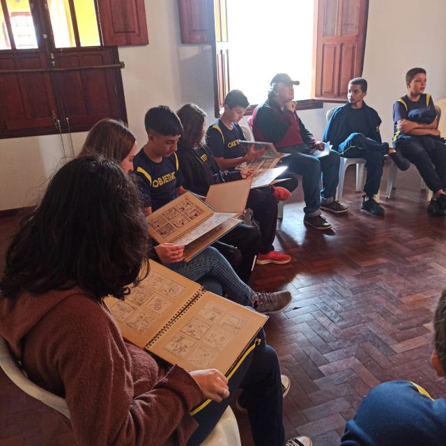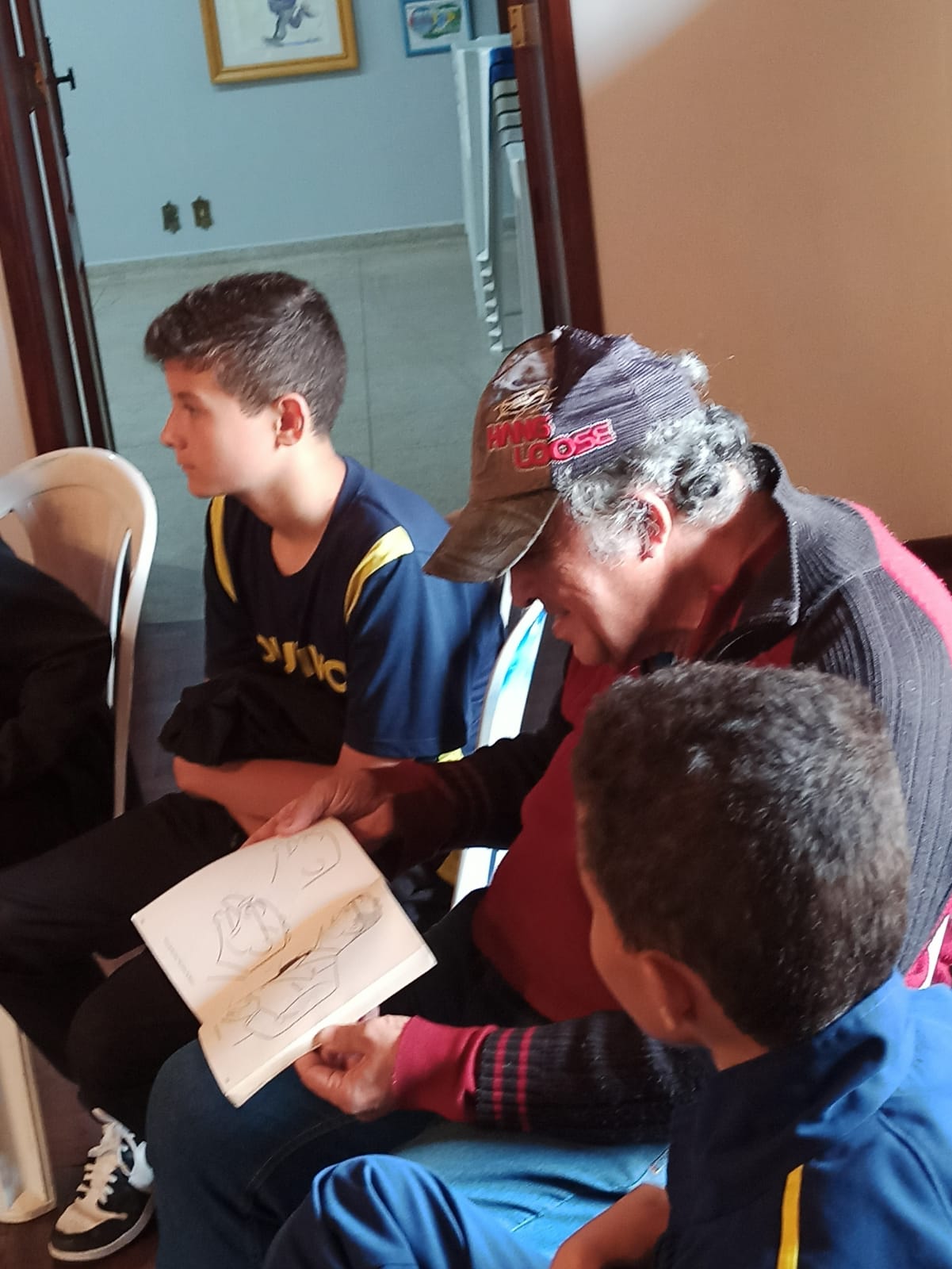 A atmosfera do evento foi descontraída e interativa, permitindo que todos os presentes participassem ativamente, fazendo perguntas sobre desenhos e expressando suas curiosidades. Além disso, foram abordados diversos temas, com destaque para as peculiaridades da cidade em que vivemos. Durante a conversa, Paulo compartilhou álbuns contendo charges, que foram passados em um grande círculo formado pelos participantes.