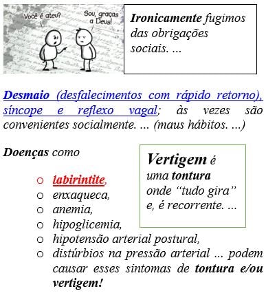 “A vertigem” é o tipo mais comum de “tontura” impressionando seu portador e quem o assiste! É também usada como desculpa para nos safarmos de compromissos pessoais e sociais. … não temos como comprovar o relatado!