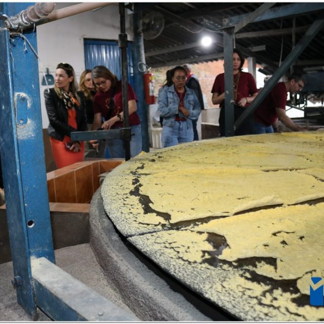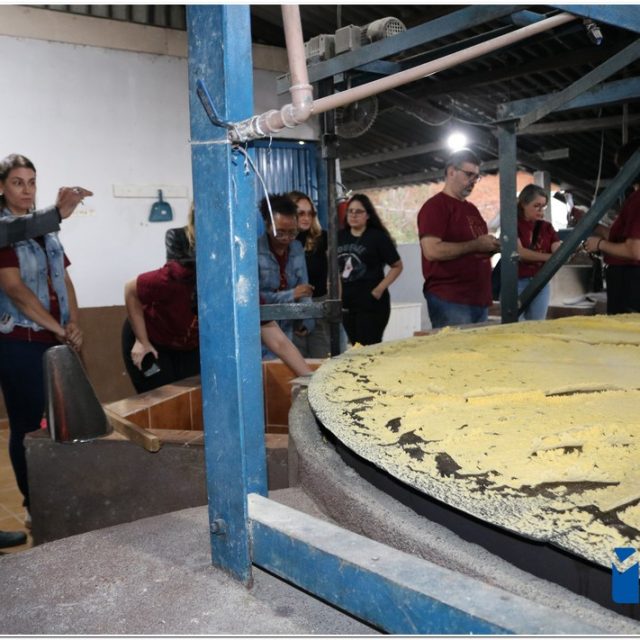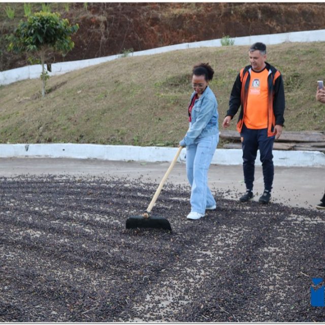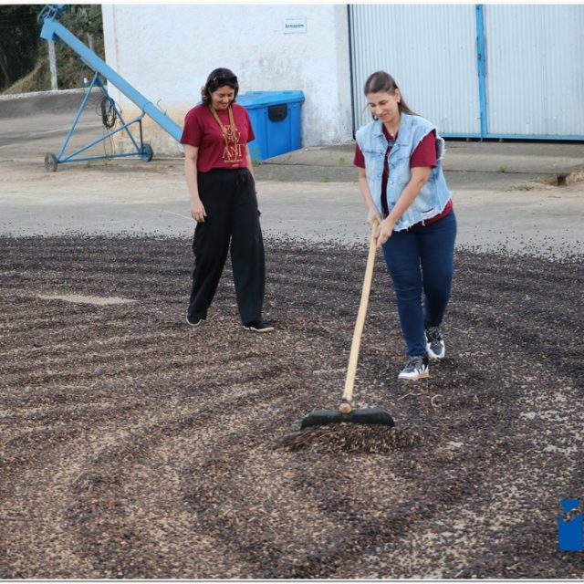 Ao chegar à sede da Agropecuária Santa Inês, os visitantes conheceram o lavador de café, onde ocorre a separação dos grãos, e tiveram a chance de “mexer” no café que estava em processo de secagem no Terreirão. Também tiveram a oportunidade de conhecer o secador de café e o processo de beneficiamento, além de presenciarem a torra artesanal da Farinha de Milho, outro produto produzido pela marca Carruá.