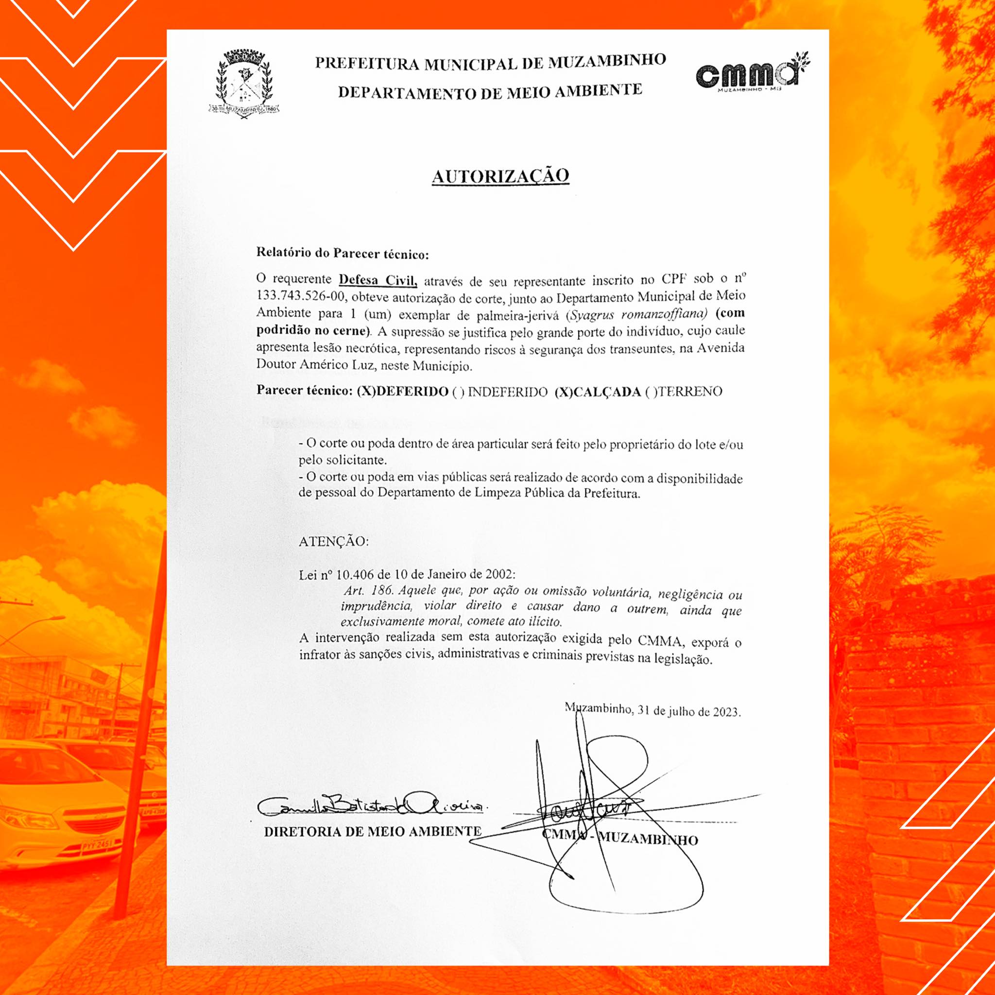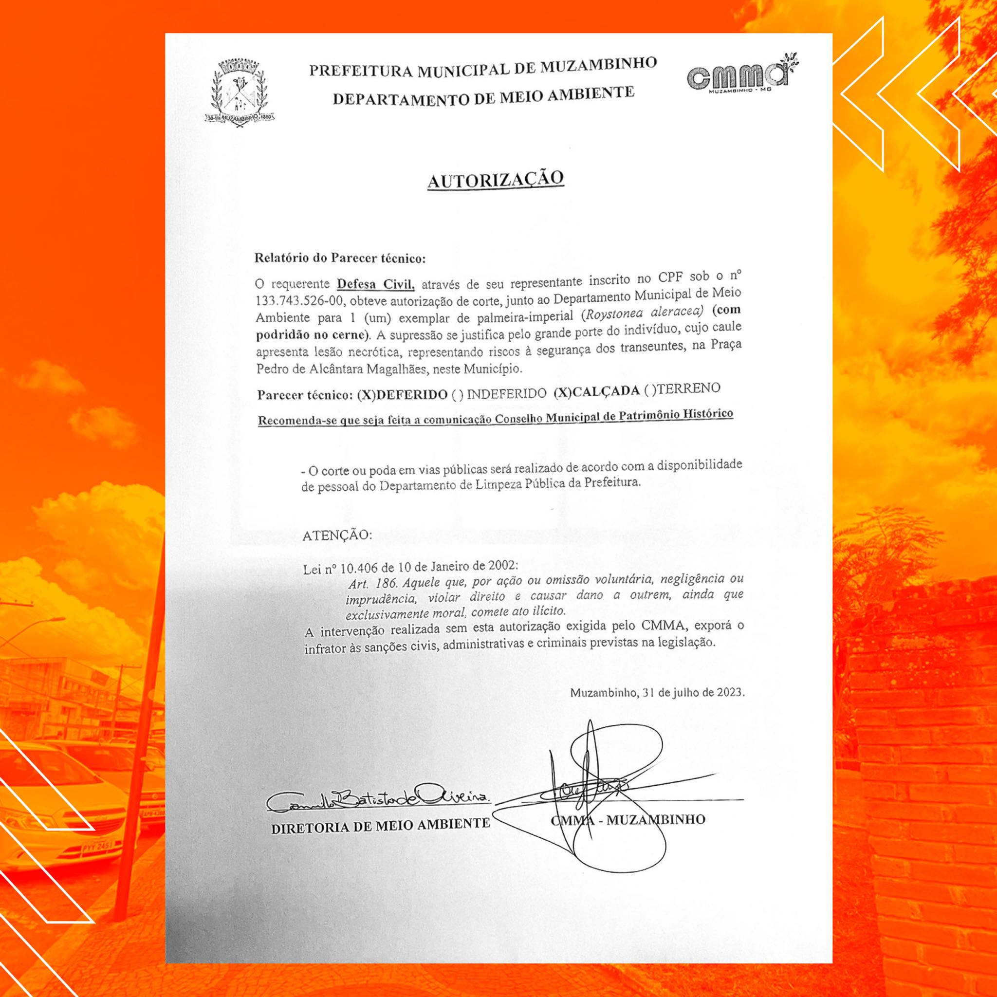 Com a responsabilidade de lidar com essa situação delicada, a Prefeitura Municipal, em conjunto com o Departamento Municipal de Meio Ambiente, a Defesa Civil e o CMMA (Conselho Municipal de Meio Ambiente), uniram esforços para abordar esse problema. Devido ao iminente risco de queda, foi decidido que as árvores devem ser removidas, a fim de prevenir quaisquer incidentes que possam afetar os pedestres.