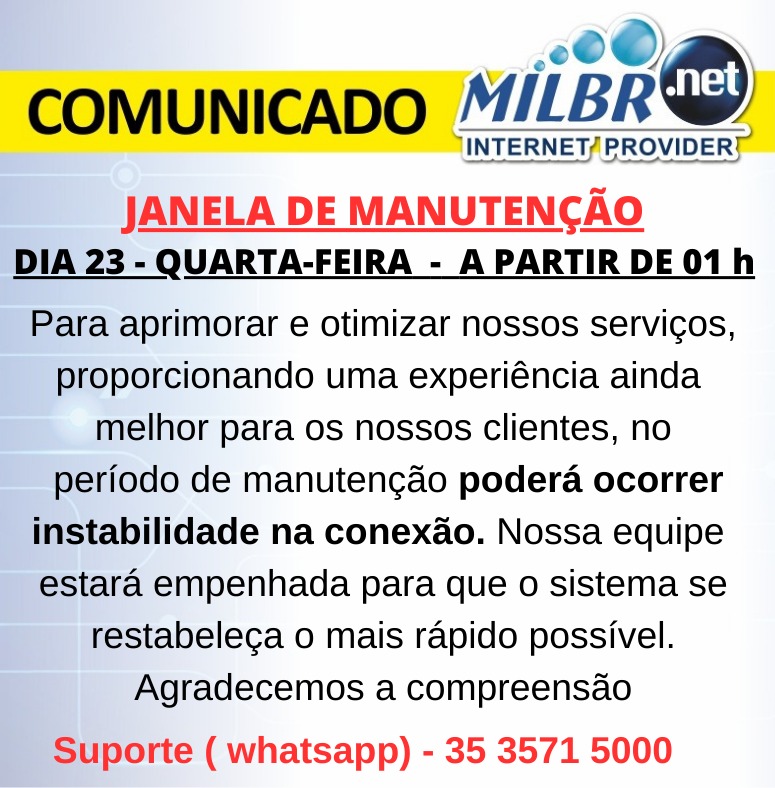 Mais Artigos DestaqueEventos e FestasNossa CidadeParceiros ObaOba Samba House agita o Sagrada Família – Bar do Edmar no dia 20 de dezembro AgronegócioDestaqueEconomia Exportação de café do Brasil totaliza 36,9 milhões de sacas em 2025 DestaqueEducaçãoNossa CidadeParceiros Encerramento Letivo 2025 do Colégio Lyceu emociona público com apresentações dos alunosDestaqueNossa CidadeParceirosMilBr comunica possível queda de internet na madrugada desta quarta-feira, 23/08 Redação22 de agosto de 20231min0Janela de Manutenção, dia 23 de agosto, quarta-feira à partir da 01hSuporte – WhatsApp: (35) 3571-5000 Post Views: 733