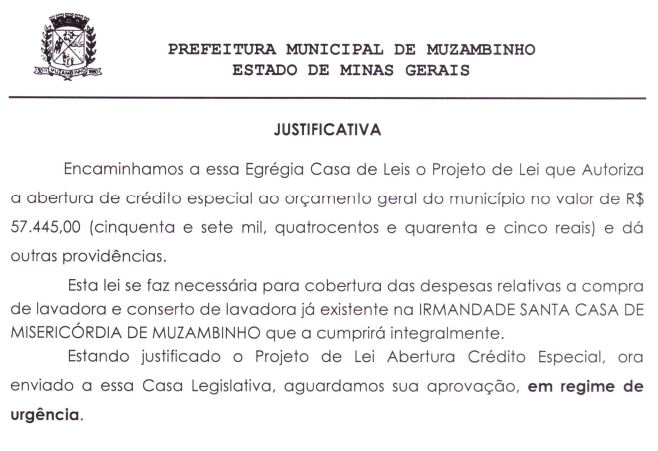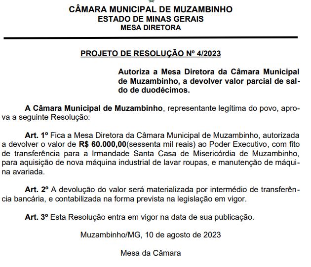 A Câmara de Vereadores de Muzambinho, através de Projeto de Resolução e Projeto de Lei, devolve e autoriza o Executivo repassar o valor de R$ 57.445,00 para a Santa Casa de Muzambinho, para o fim específico de compra uma nova lavadora e conserto da lavadora que estava em uso, ficando assim com duas lavadora em condições de uso.