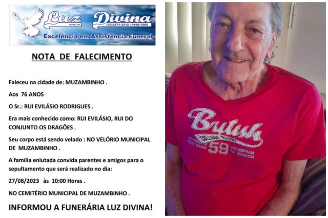 Mais Artigos DestaqueEsportesEventos e FestasNossa Cidade 1ª Corrida Amor Azul mobiliza comunidade em Muzambinho e reforça conscientização sobre o autismo AgronegócioDestaqueEducaçãoNossa Cidade ENCONTEC 2026 movimenta Muzambinho com inovação, tecnologia e integração entre comunidade e estudantes DestaqueObituário Faleceu aos 69 anos a Sra. Aparecida Alves Ribeiro LopesDestaqueObituárioFaleceu aos 76 anos, o Sr. Rui Evilásio Rodrigues Redação26 de agosto de 20231min0Informou a Funerária Luz Divina A família enlutada, nossos sinceros sentimentos de pesares, que Deus os abençoe e conforte. Post Views: 1.011EnterroFuneráriaLuz DivinamorteobituárioSepultamentoVelório