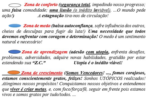 “ZONAS DE CONFORTO” (“Z.C.”) são reais, são nossas conquistas merecidas, mas, duram pouco tempo. Utilize suas “Z.C.” como trampolins, para atingir níveis mais altos em todas as atividades vivenciadas e compartilhadas. Nunca durma e/ou cochile na “Z.C.”, é apenas um local mental de descanso, nos preparando para a luta e para o nosso crescimento!