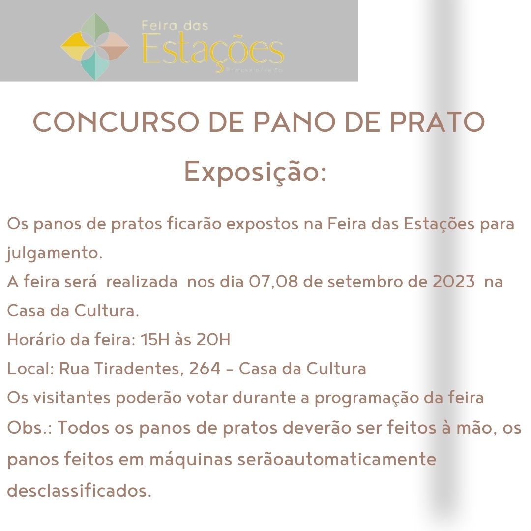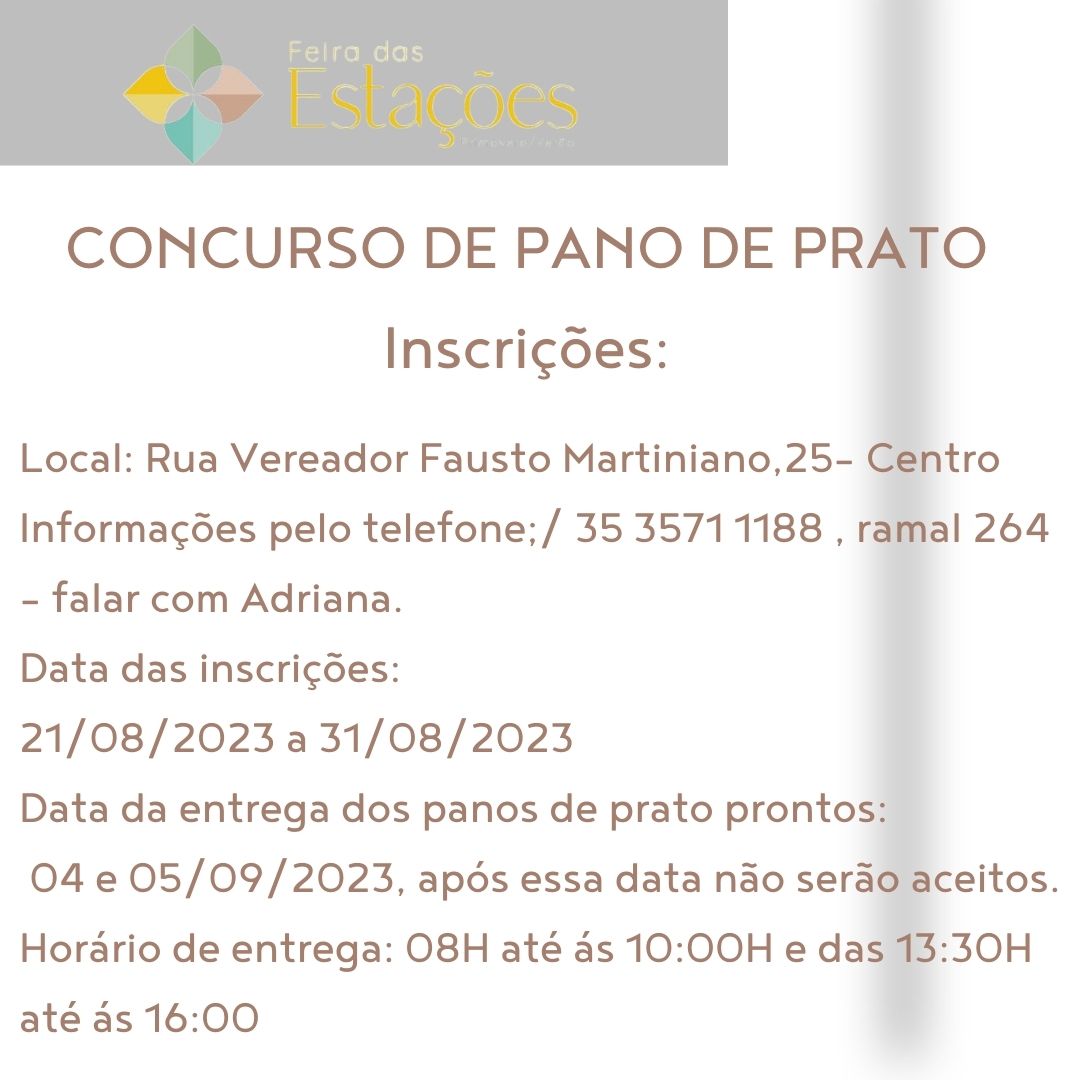 Mais Artigos DestaqueObituário Faleceu aos 71 anos o Sr. Antônio de Lima DestaqueObituário Faleceu aos 70 anos o Sr. João Ambrósio da Silva DestaqueMensagens O Muzambinho.com deseja um Feliz Natal a todos os nossos internautasDestaqueNossa CidadeParceirosEsta semana tem Feira das Estações – Primavera/Verão 2023 Redação4 de setembro de 20231min0Dias 07 e 08 de Setembro/23 - das 15h às 20h na Casa da Cultura de Muzambinho-MG Post Views: 1.087EstaçõesfeiraPrefeitura