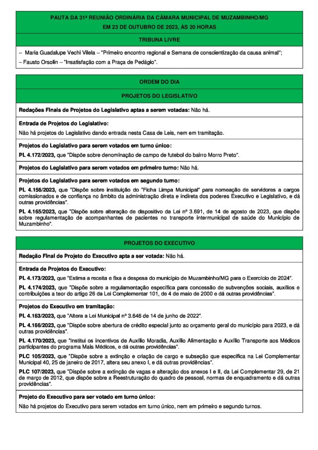 31ª Reunião Ordinária de Vereadores em Muzambinho – 23/10/2023