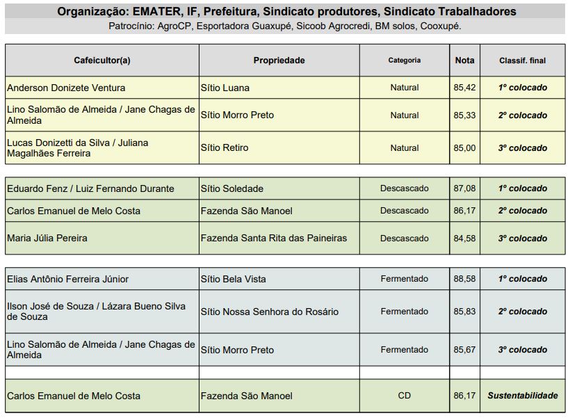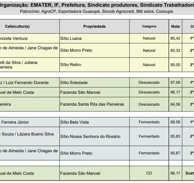 Os vencedores das quatro categorias, Café Natural, Café Cereja Descascado, Café Fermentado e Sustentabilidade, receberam merecidos reconhecimentos por sua dedicação e excelência na produção de café. O concurso, organizado por entidades locais, como EMATER, IF, Prefeitura, Sindicato de Produtores e Sindicato dos Trabalhadores, foi generosamente patrocinado por empresas influentes, incluindo AgroCP, Exportadora Guaxupé, Sicoob Agrocredi, BM Solos e Cooxupé.