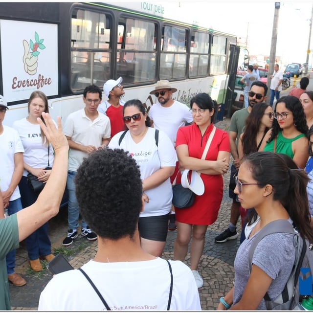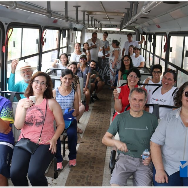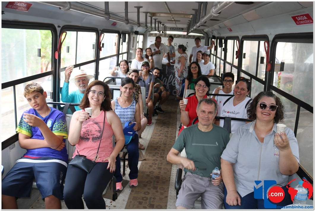 A bordo da charmosa “Ritinha”, o ônibus da Carruá Turismo que levas turistas pela Rota dos Cafés Especiais Minas – São Paulo. o grupo seguiu passando pelo Paço Municipal, Praça Pedro de Alcântara, Casa da Cultura, e o imponente Chapéu de Sol, Praça D Pedro II, Fonte e Bancos de Pedra, com Fernando Magalhães compartilhando detalhes sobre a importância destes monumentos para Muzambinho.