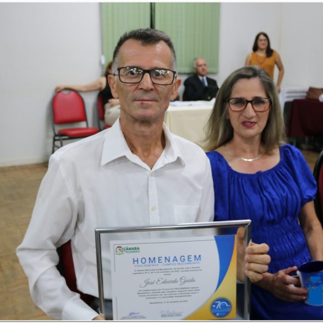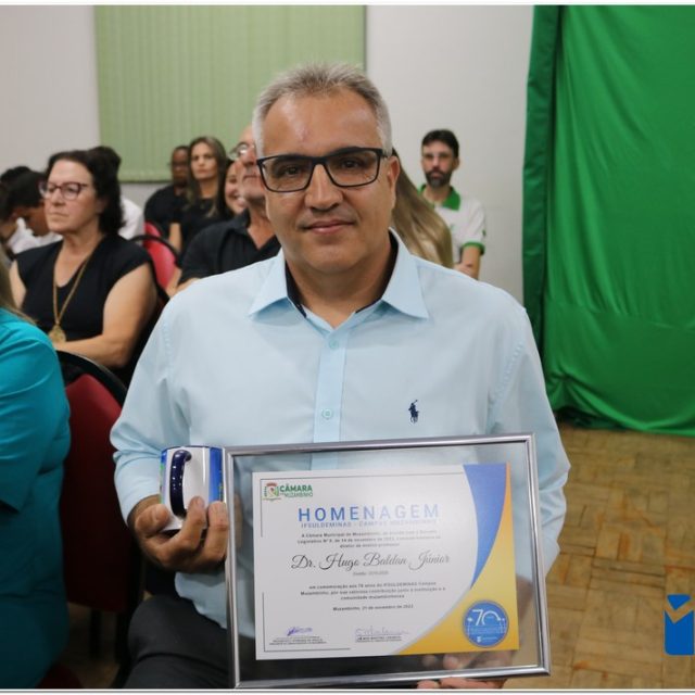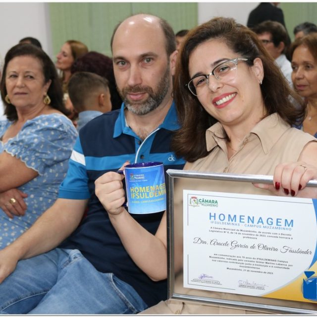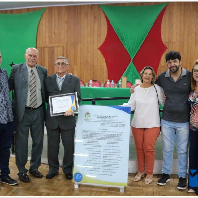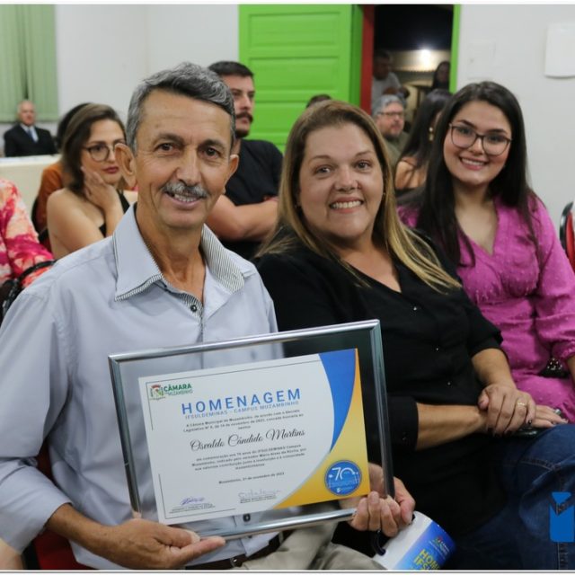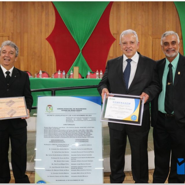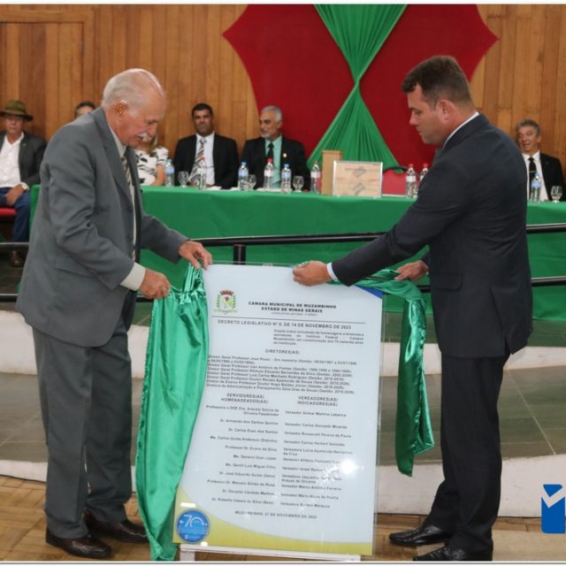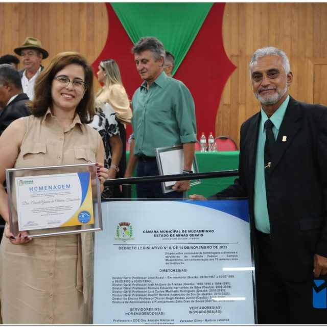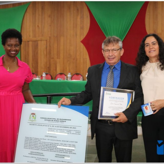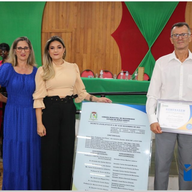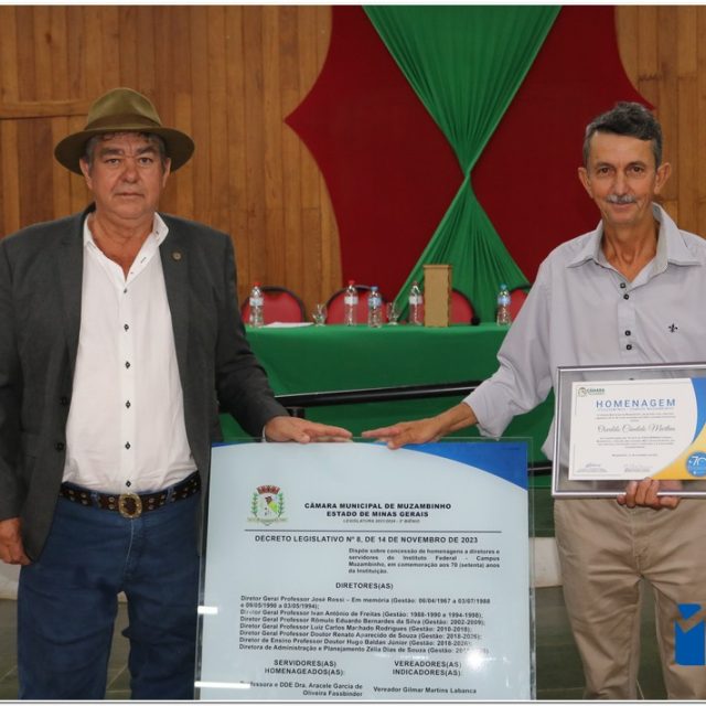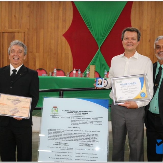Em uma cerimônia emocionante, a Câmara Municipal de Muzambinho, Estado de Minas Gerais, na noite desta terça-feira, 21/11, concedeu homenagens a diretores e servidores do Instituto Federal – Campus Muzambinho, em comemoração aos 70 anos da Instituição. O Decreto Legislativo n º 8, de 14 de novembro de 2023, assinado pelo presidente da Câmara, Roosevelt Pereira de Paula, formalizou as distinções em reconhecimento aos relevantes serviços prestados ao longo dos anos.