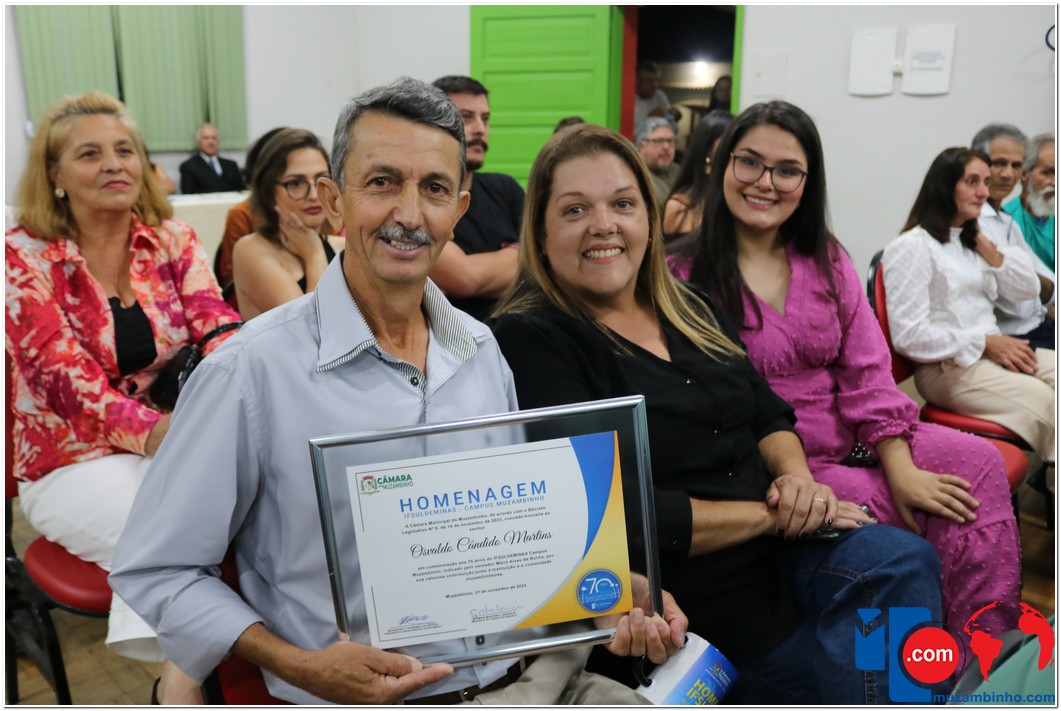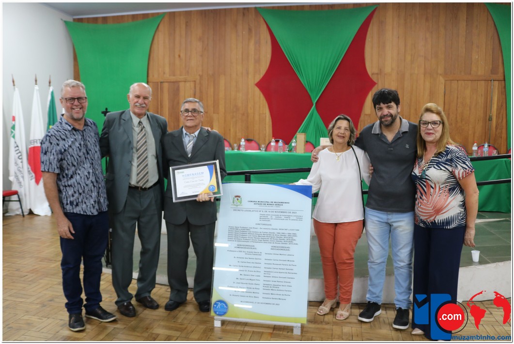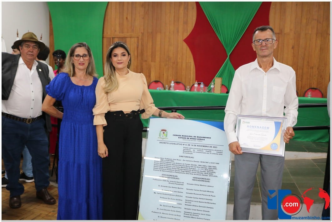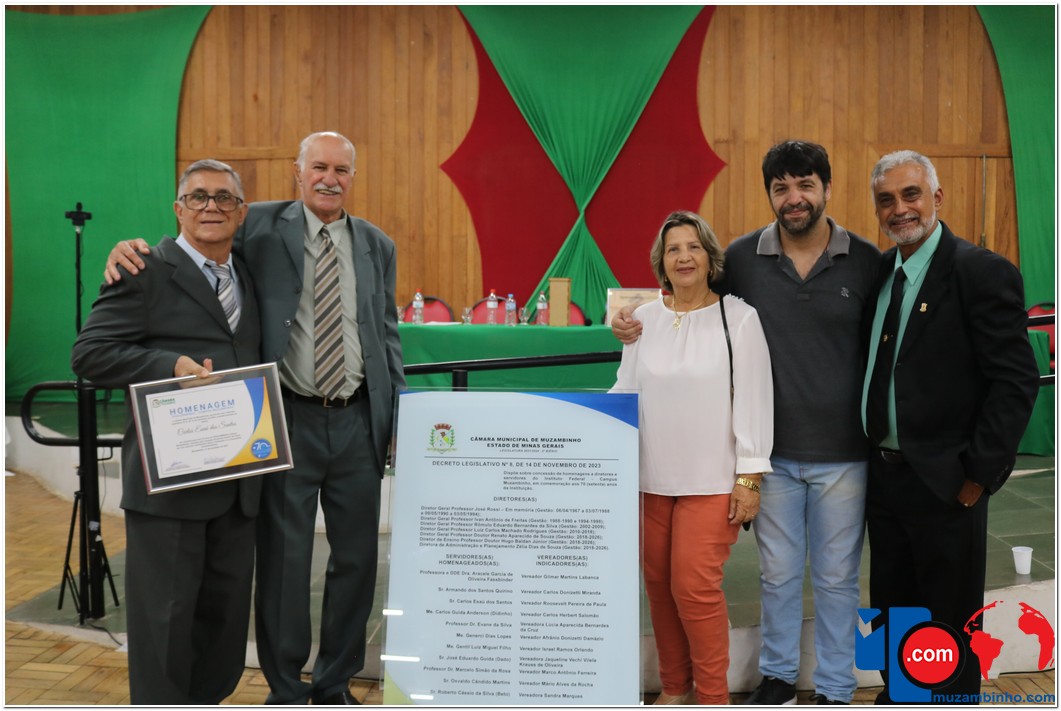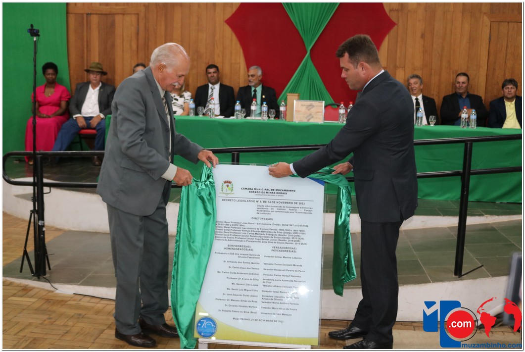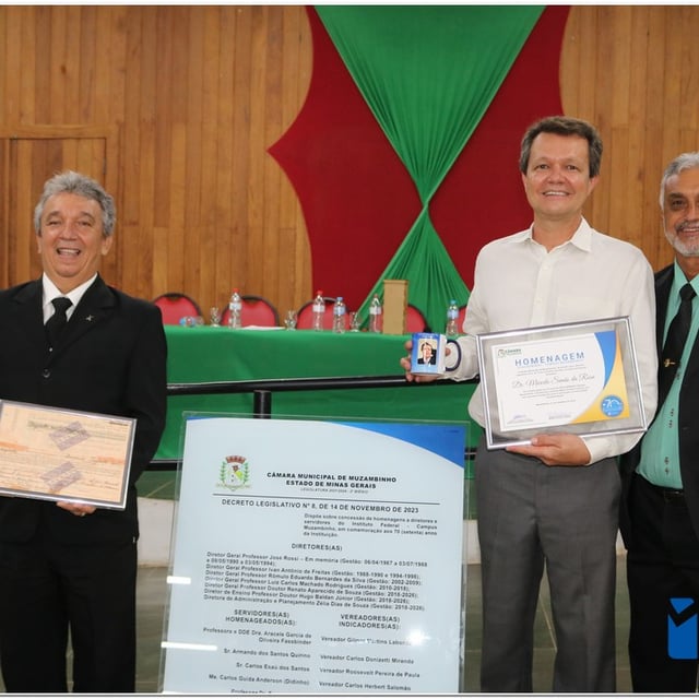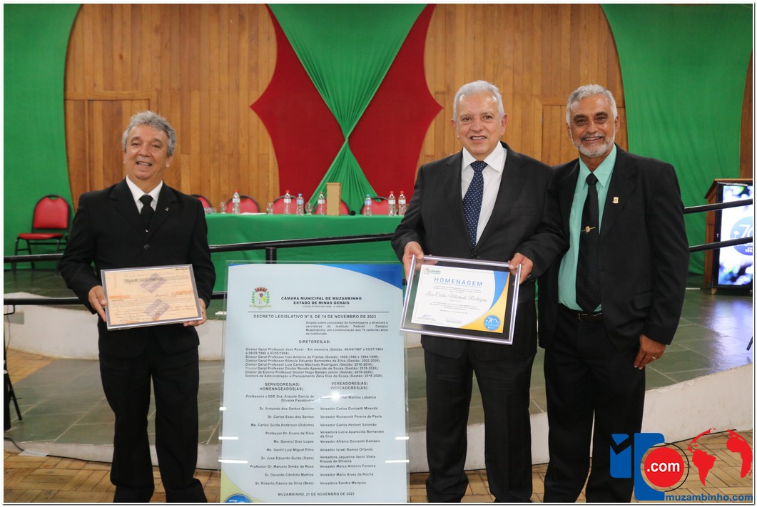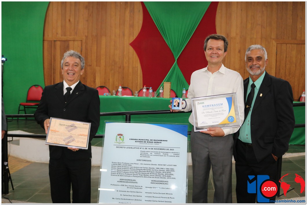 Em uma cerimônia emocionante, a Câmara Municipal de Muzambinho, Estado de Minas Gerais, na noite desta terça-feira, 21/11, concedeu homenagens a diretores e servidores do Instituto Federal – Campus Muzambinho, em comemoração aos 70 anos da Instituição. O Decreto Legislativo n º 8, de 14 de novembro de 2023, assinado pelo presidente da Câmara, Roosevelt Pereira de Paula, formalizou as distinções em reconhecimento aos relevantes serviços prestados ao longo dos anos.