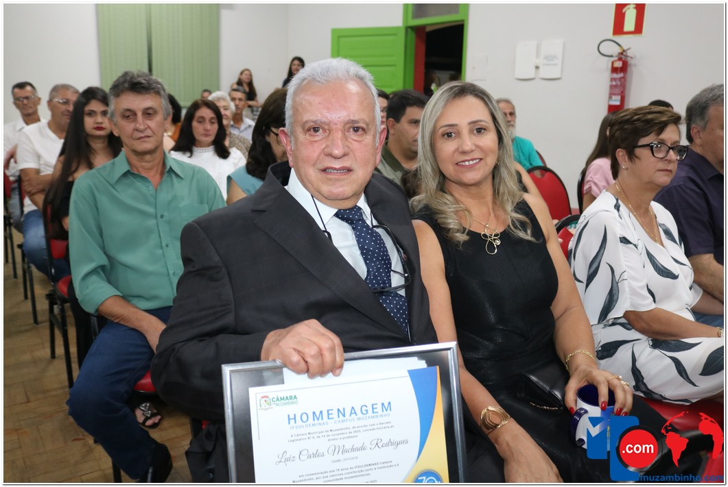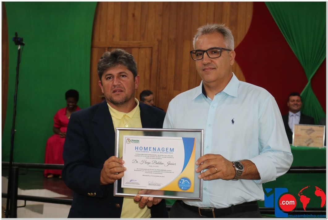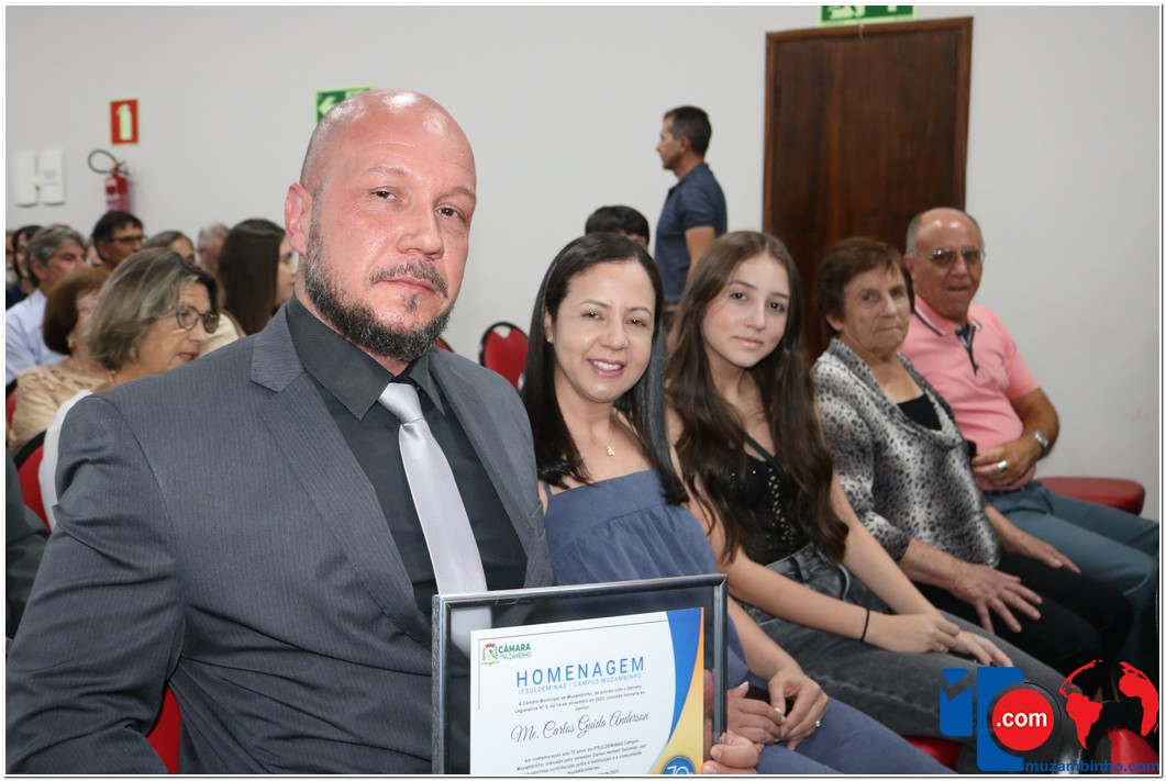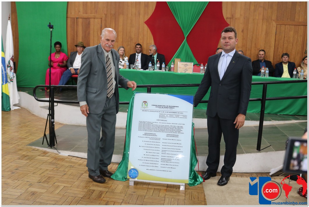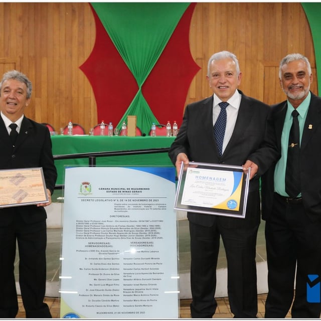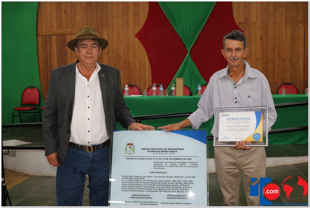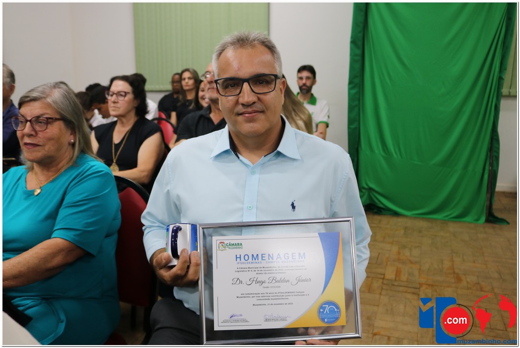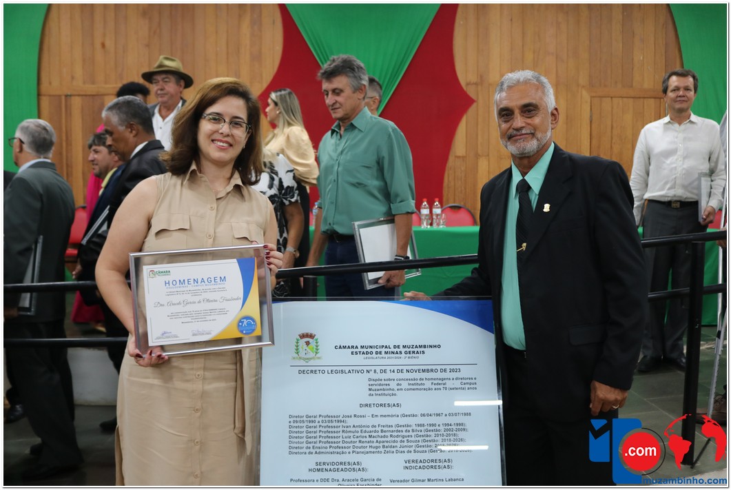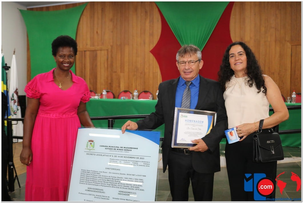 Em uma cerimônia emocionante, a Câmara Municipal de Muzambinho, Estado de Minas Gerais, na noite desta terça-feira, 21/11, concedeu homenagens a diretores e servidores do Instituto Federal – Campus Muzambinho, em comemoração aos 70 anos da Instituição. O Decreto Legislativo n º 8, de 14 de novembro de 2023, assinado pelo presidente da Câmara, Roosevelt Pereira de Paula, formalizou as distinções em reconhecimento aos relevantes serviços prestados ao longo dos anos.