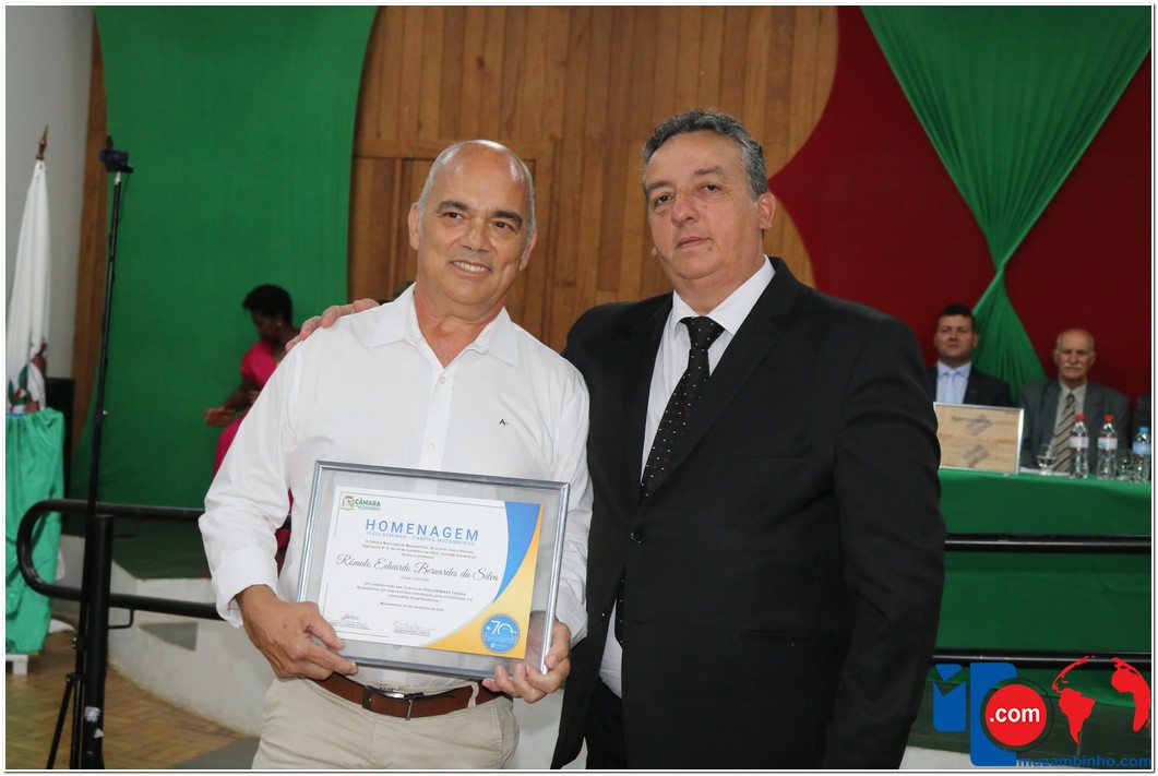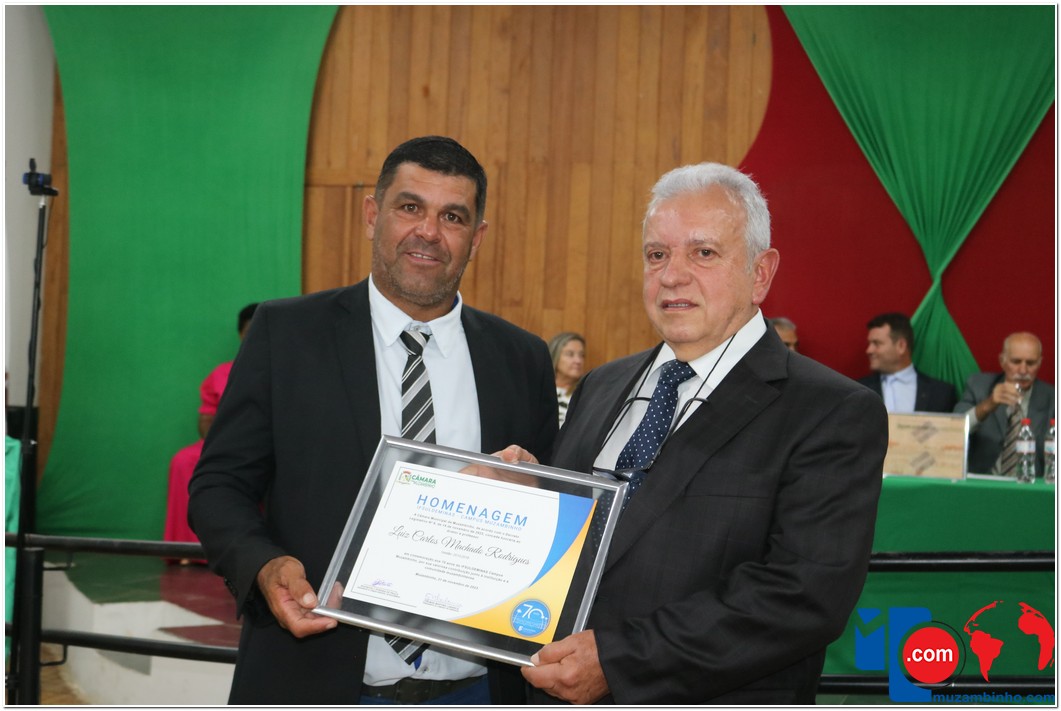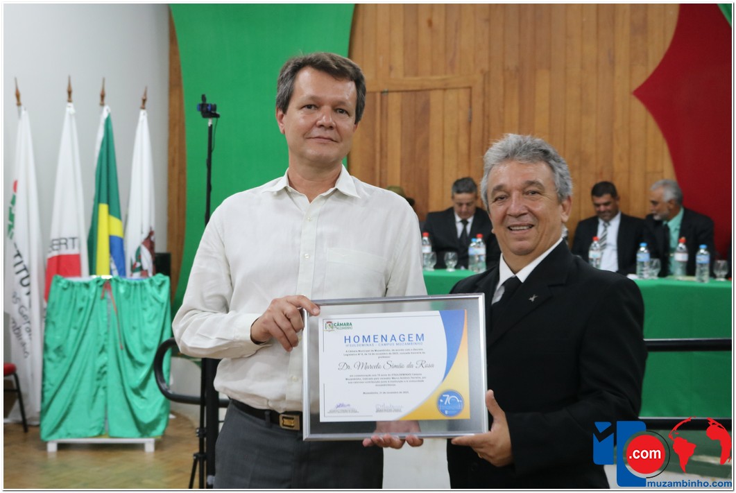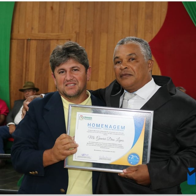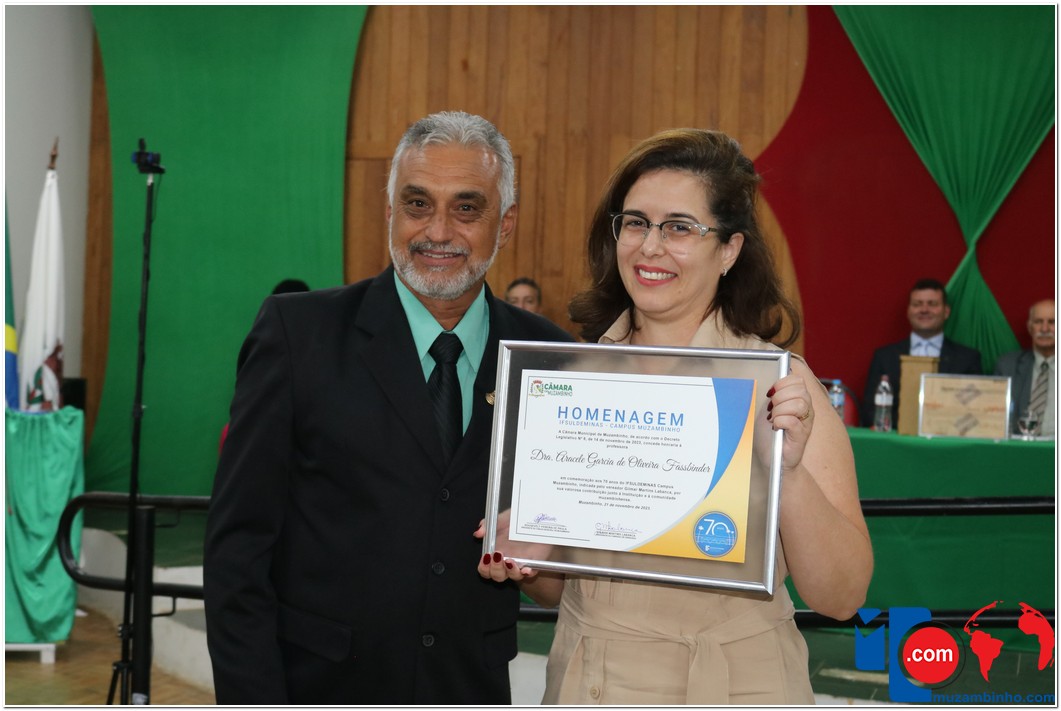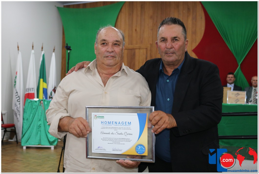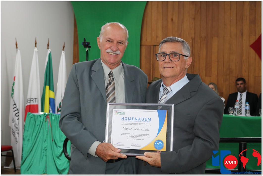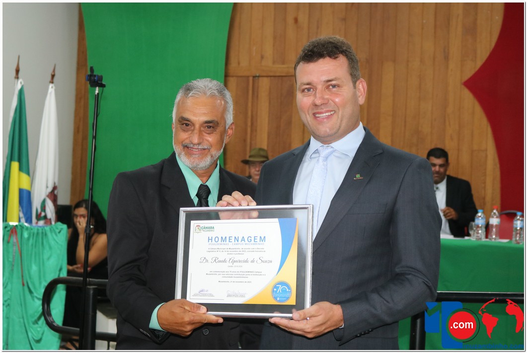 Em uma cerimônia emocionante, a Câmara Municipal de Muzambinho, Estado de Minas Gerais, na noite desta terça-feira, 21/11, concedeu homenagens a diretores e servidores do Instituto Federal – Campus Muzambinho, em comemoração aos 70 anos da Instituição. O Decreto Legislativo n º 8, de 14 de novembro de 2023, assinado pelo presidente da Câmara, Roosevelt Pereira de Paula, formalizou as distinções em reconhecimento aos relevantes serviços prestados ao longo dos anos.