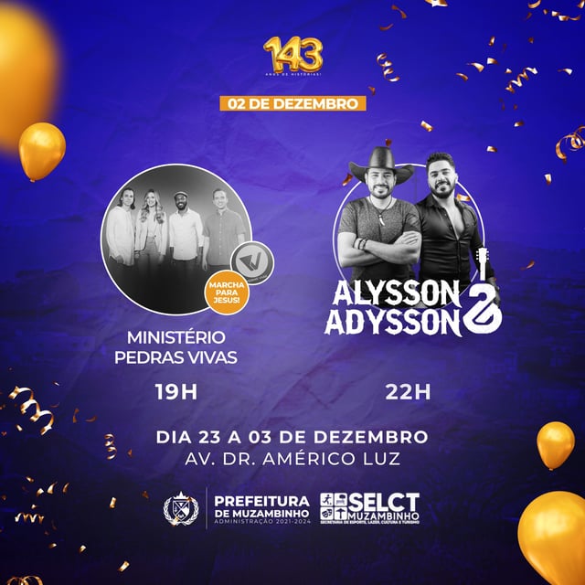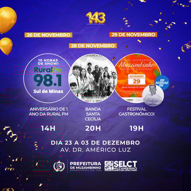 Mais Artigos Cozinha e CulináriaDestaqueNossa CidadeParceiros Clássica, suculenta e cheia de sabor! Nossa Pizza de Calabresa é aquela escolha certeira que agrada todo mundo! Cozinha e CulináriaDestaqueNossa CidadeParceiros Quer atrair mais clientes para sua Pizzaria? DestaqueObituário Faleceu aos 64 anos a Sra. Terezinha Gonçalves de Oliveira DestaqueEventos e FestasNossa CidadeConfira a programação completa do aniversário de Muzambinho Redação29 de novembro de 20231min0 143 ANOS DE HISTÓRIAS! Nesta Quarta-feira, 29/11, Festival Gastronômico na Avenida as 19h Confira a programação completa do aniversário do nosso município Post Views: 1.788