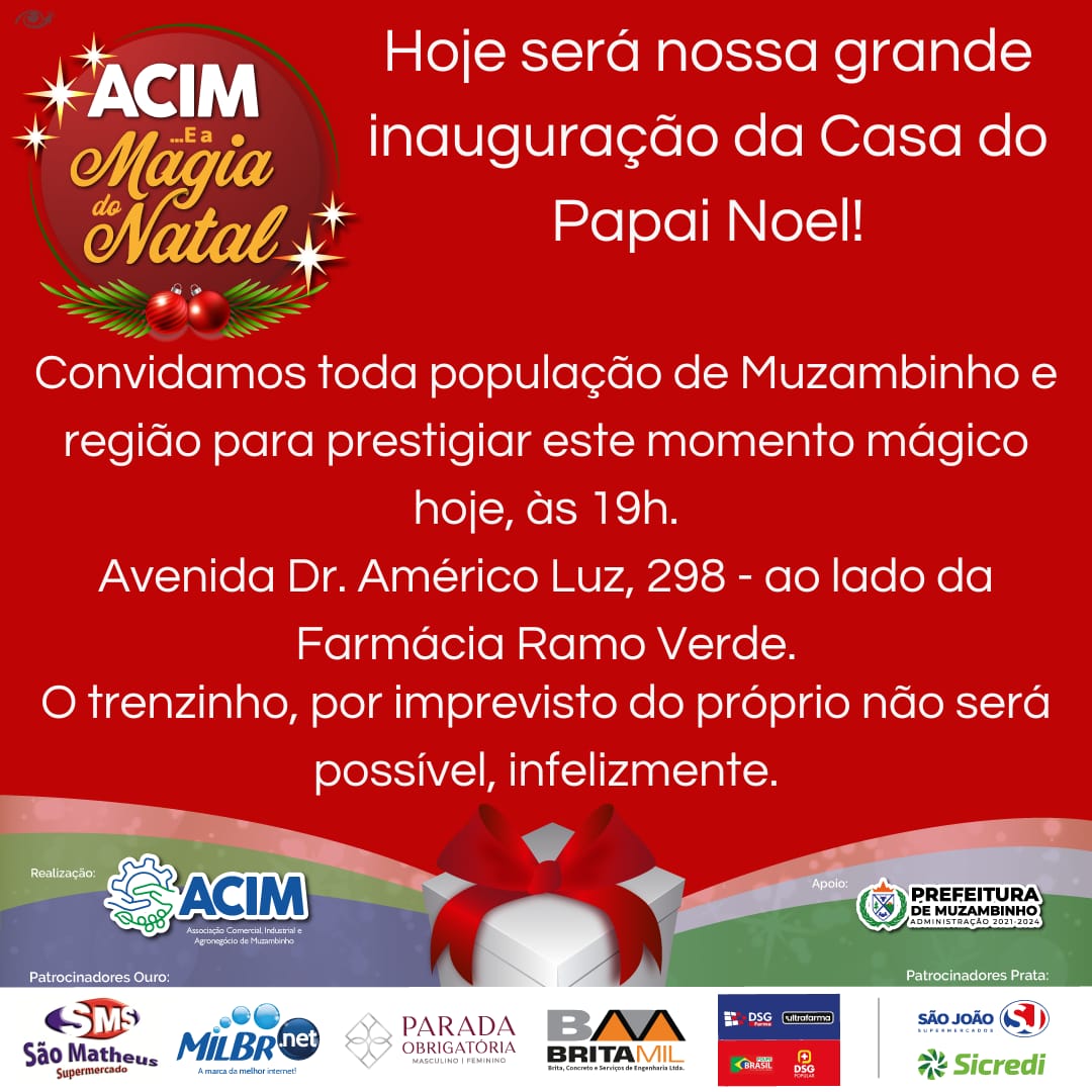 Mais Artigos DestaqueObituário Faleceu aos 67 anos o Sr. José Pedro de Melo DestaqueEsportesNossa Cidade O esporte vai tomar conta de Muzambinho com as Olimpíadas da SELCT DestaqueExecutivoNossa Cidade Atenção moradores: coleta de lixo muda nos feriados de fim de ano em MuzambinhoDestaqueEventos SociaisNossa CidadeInauguração da Casa do Papai Noel em Muzambinho Redação6 de dezembro de 20231min0Nesta quarta-feira, 06/12, às 19 horas na Avenida Dr. Americo Luz, n 289, ao lado da Farmácia Ramo Verde. Post Views: 824EventoNatal